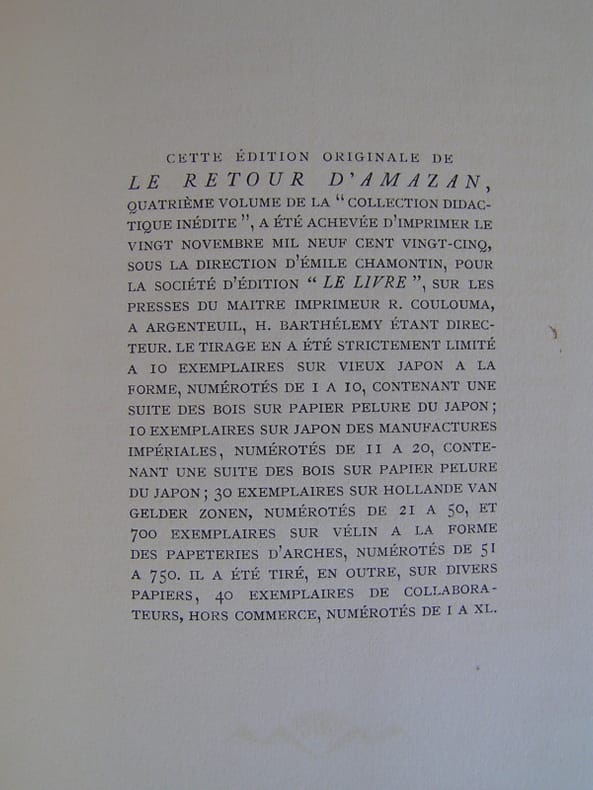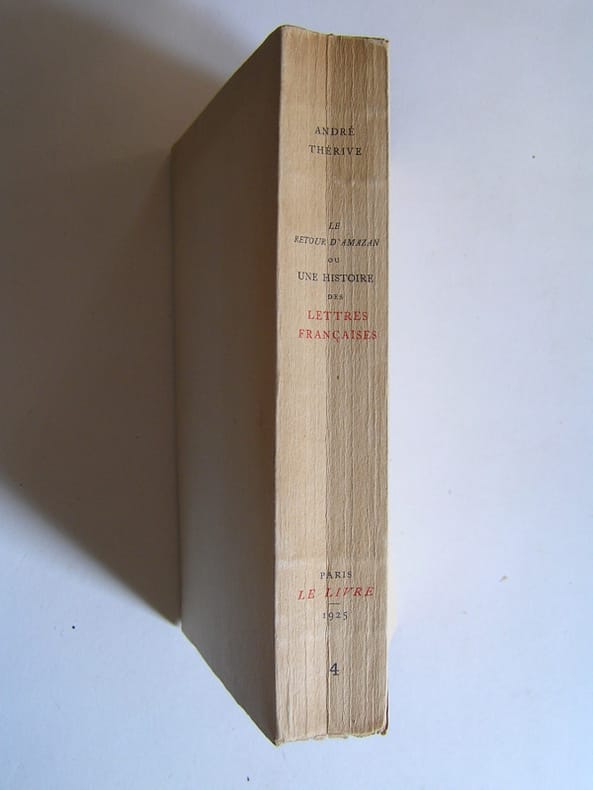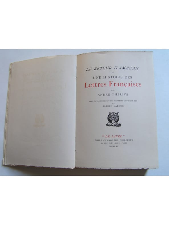 État : Très bon état - Année : 1925 - Format : Petit in 4° - Pages : 352pp - Editeur : Emile Chamontin, Directeur - Lieu d'édition : Paris - Type : Broché sous couv rempliée - Divers : très légère brunissure des bords des plats de couv. Qqes plis de lecture au dos. Intérieur bien propre. - Collection : Le Livre - Commander rapidement : https://www.bons-livres.fr/livre/andre-therive/10221-le-retour-d-amazan-ou-une-histoire-des-lettres-francaises?lrb