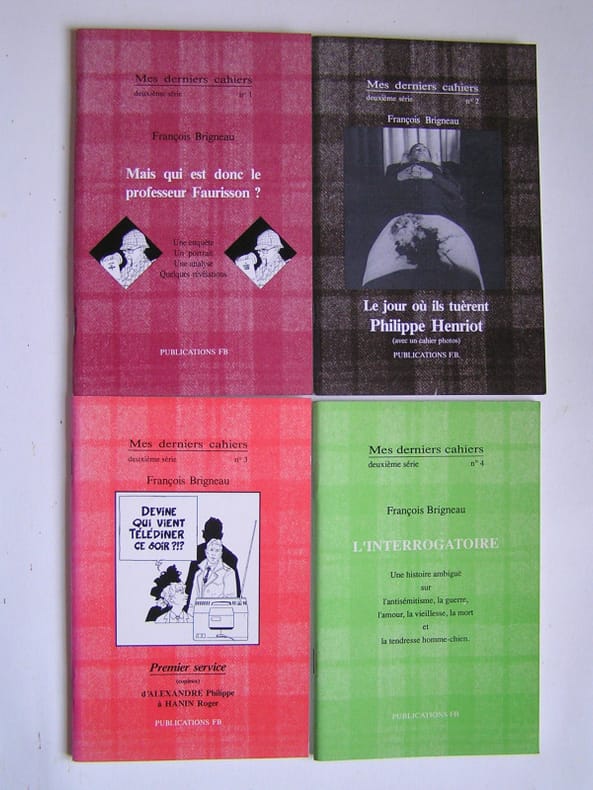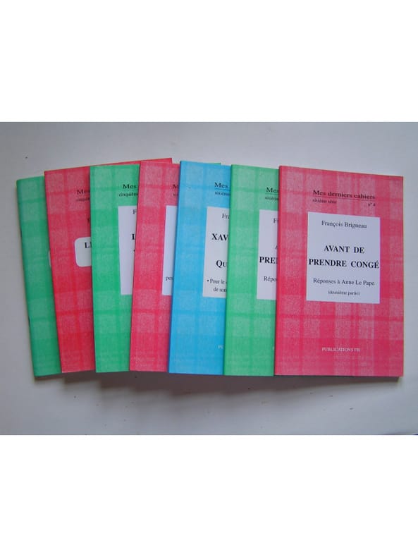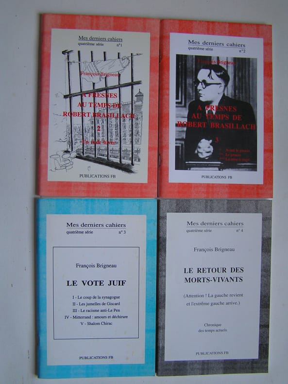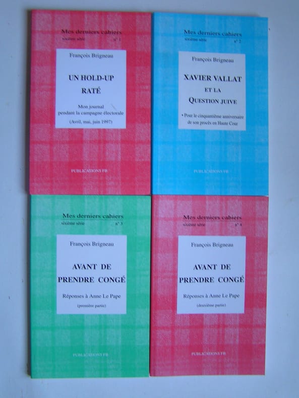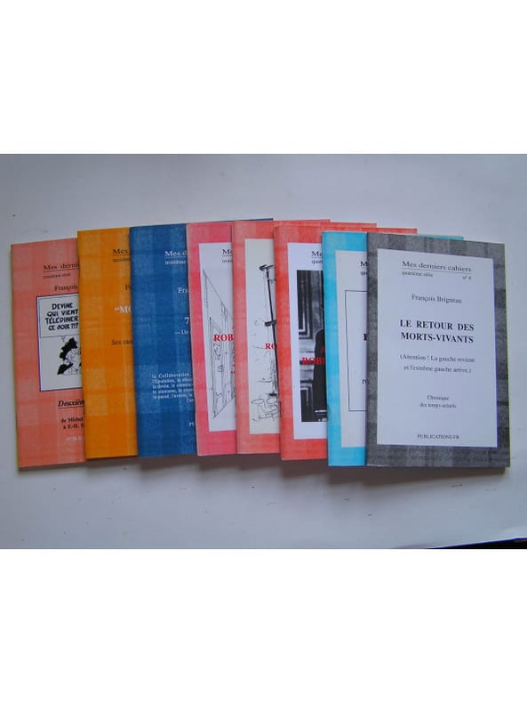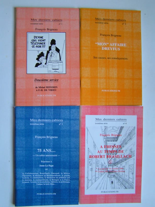 Collection complète publiée de juin 1991 à juin 1998. ˮJ'essaierai de mêler les souvenirs et l'actualité, la vie politique et la vie sans politique, les grands thèmes, la mort, l'amour, les hommes, à ma façon, bien sûr, qui n'est jamais austère.ˮ ˮJ'aurais voulu partir comme un danseur de pardon breton... Je m'en vais comme un laboureur harassé, qui entend l'Angélus du soir, pense à la maisonnée, au Bon Dieu, se retourne et se demande si le grain lèvera jamais dans son sillon.ˮ Dans ces 23 cahiers (dont un double sur la justice), tiré entre 3000 et 6000 exemplaires suivant les sujets,François Brigneau aborde tous les sujets qui lui sont chers avec la rigueur du journaliste (doublé parfois de celle de l'historien) et de la verve du polémiste qui lui sont reconnues tant par ses admirateurs que par ses contempteurs. On peut ne pas être d'accord sur tout mais on est contraint, à la lecture de ces cahiers, de lui reconnaître un certain courage et d'indéniables talents de conteur. Les sujets les plus variés sont ainsi traités: Mgr Lefèbvre; le Maréchal Pétain; Philippe Henriot; Le Pen et beaucoup d'autres sujets ˮpolitiquement incorrectsˮ et, bien sûr, dans trois merveilleux cahiers de piété fraternelle, le poète fusillé, Robert Brasillach.