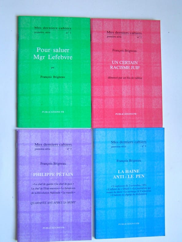 État : Très bon état - Année : 1991 à 1998 - Format : in 8° - Tome(s) : 23 brochures - Pages : de 60 à 150pp - Editeur : Publications F.B. - Lieu d'édition : Paris - Type : Broché - Collection : Mes derniers cahiers - Commander rapidement : https://www.bons-livres.fr/livre/francois-brigneau/10232-mes-derniers-cahiers-complet-des-six-series?lrb