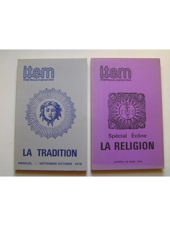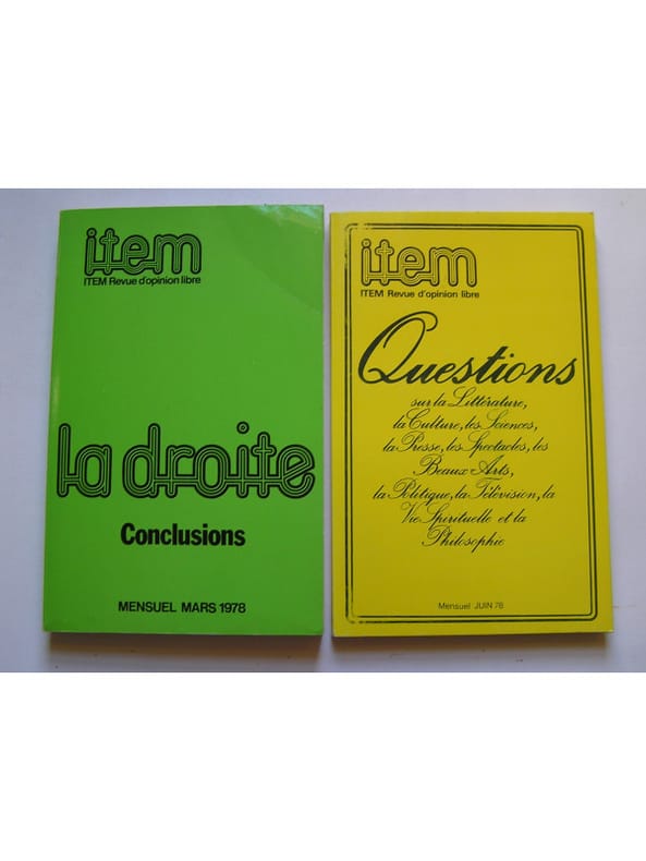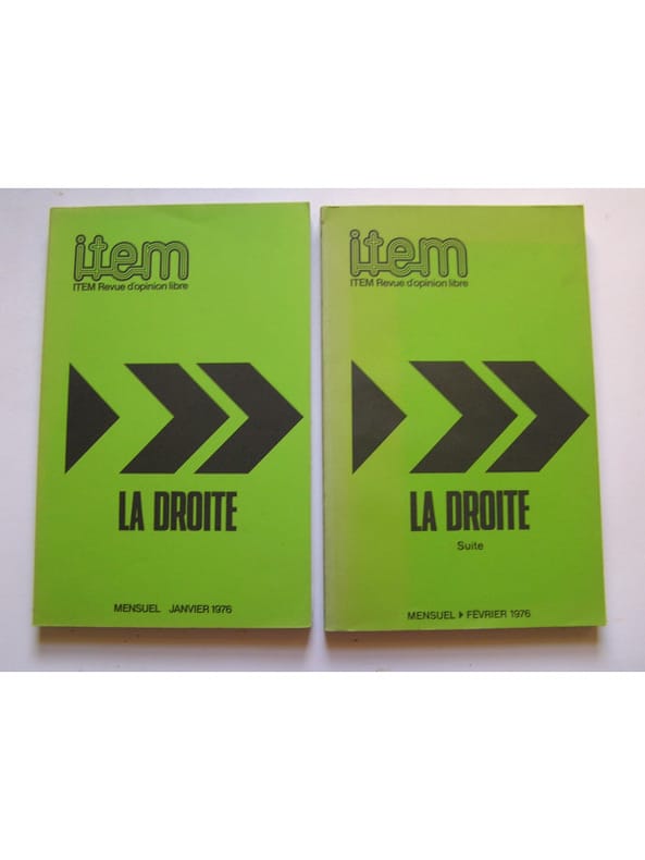 L'ensemble des 11 premiers numéros (numéroté de 01-02 à 14) de la revue (manque le n°7 numéro spécial sur les éléction municipales de 1977) auxquels nous ajoutons: le numéro de juin 1978 sur ˮQuestionsˮ. Sous la direction de Philippe Héduy, on y retrouve toutes les grandes plumes de la Droite nationale des années 70 sans exclusive. 01-La Droite; 02-La Droite (suite); 1-L'Ordre; 2-La Liberté; 3-La Patrie; 4-Témoignages sur le génocide du Cambodge; 5-La Tradition; 6-Spécial Ecône. La Religion; 8.9.10-L'Education. La Morale. La Famille; 11.12.13- Le Pouvoir. L'Armée. Le Travail; 14-La Droite. Conclusion. N° de juin 1978-Questions sur la littérature, la culture, les sciences...