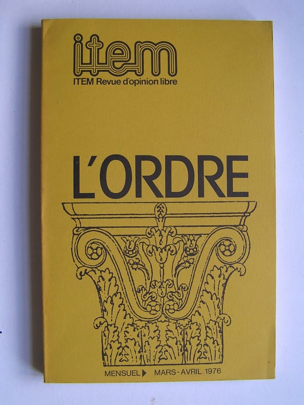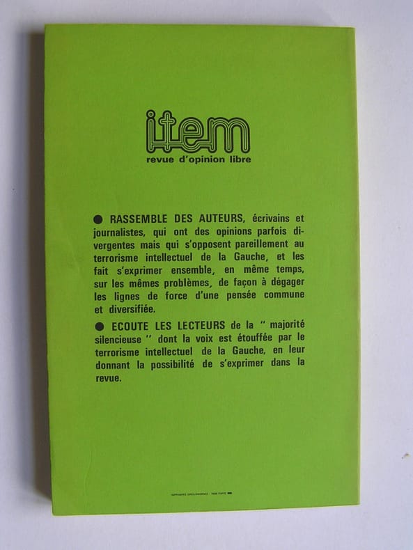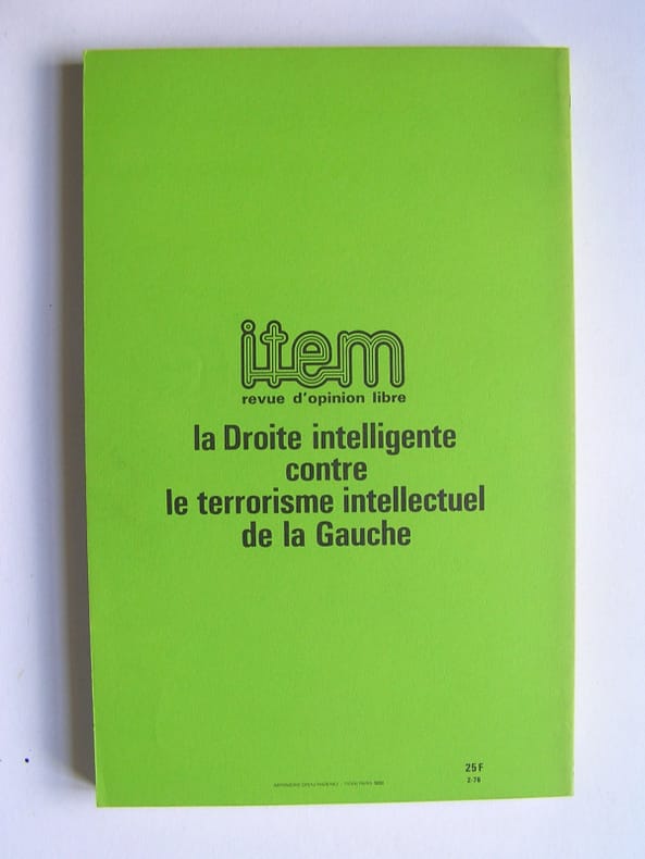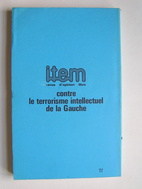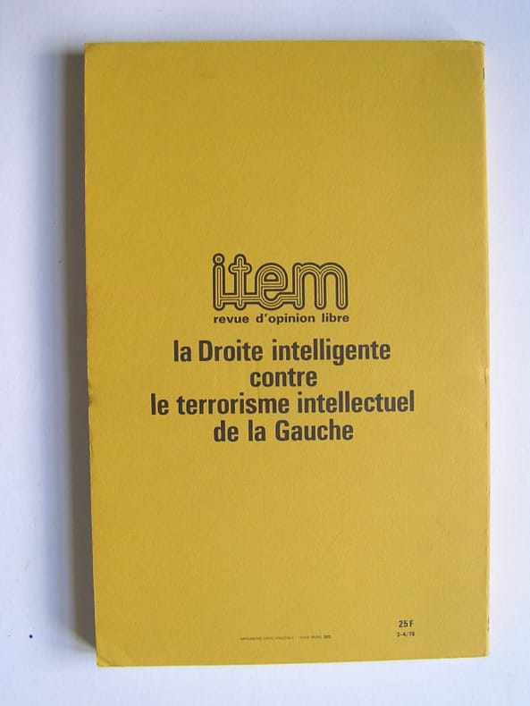 Satellisation d'Item. Pierre Chaunu, Dom Guillou, J.-M. Le Pen, Louis Pauwels et J.C. Ribes autour d'une table ronde. A. de Benoist: Contre le totalitarisme. S. de Beketch, Ordre et bonheur. Fr. Bluche, Romains 13. M. Dem, Un certain désordre... Classification Dewey : 320-Science politique