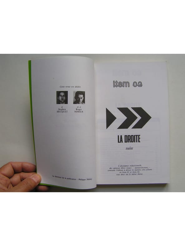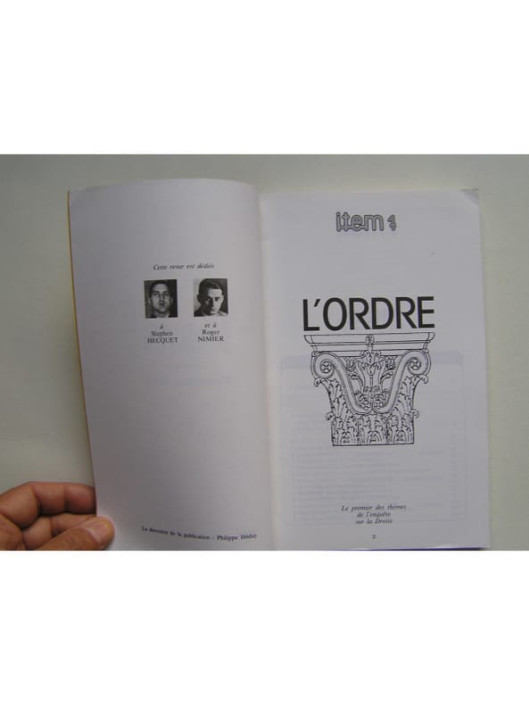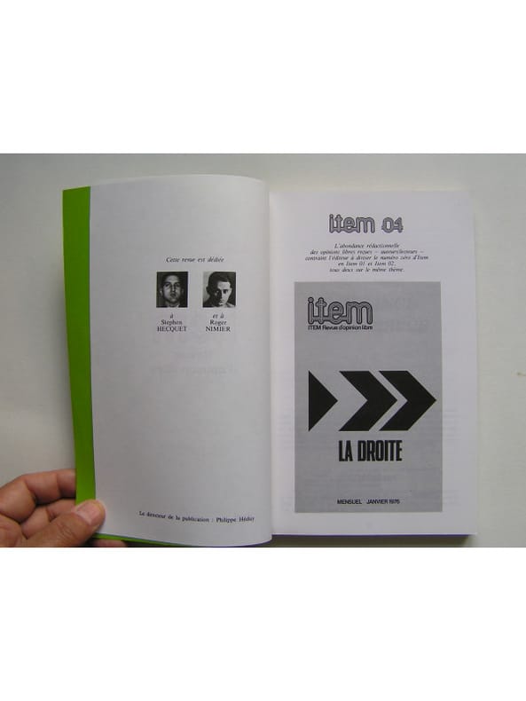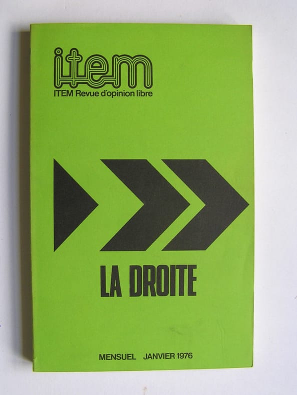 L'ensemble des 11 premiers numéros (numéroté de 01-02 à 14) de la revue (manque le n°7 numéro spécial sur les éléction municipales de 1977) auxquels nous ajoutons: le numéro de juin 1978 sur ˮQuestionsˮ. Sous la direction de Philippe Héduy, on y retrouve toutes les grandes plumes de la Droite nationale des années 70 sans exclusive. 01-La Droite; 02-La Droite (suite); 1-L'Ordre; 2-La Liberté; 3-La Patrie; 4-Témoignages sur le génocide du Cambodge; 5-La Tradition; 6-Spécial Ecône. La Religion; 8.9.10-L'Education. La Morale. La Famille; 11.12.13- Le Pouvoir. L'Armée. Le Travail; 14-La Droite. Conclusion. N° de juin 1978-Questions sur la littérature, la culture, les sciences...
