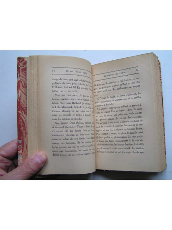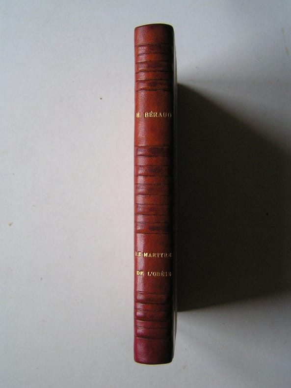 Ce roman fut à l'origine une nouvelle frivole, de commande, qui se charpenta et devint volumineuse; elle obtint, en 1922, le prix Goncourt avec un autre roman, plus sérieux, ˮLe vitriol de luneˮ. C'est l'histoire d'un ˮgrosˮ tombé amoureux d'une femme, belle mais sotte, qui quitte son mari qui la trompe. Le narrateur raconte ses amours contrariés avec humour sans trop se prendre au sérieux. En fait, tout en restant léger et un peu superficiel, ce roman n'est pas aussi négligeable que certains le pensent. Il est écrit dans une belle langue, bien française, et les réflexions qu'il suscite sont souvent très subtiles. ˮLe Martyre vaut bien mieux que sa réputation de pochade humoristiqueˮ (Francis Bergeron). Edition établie dans une agréable reliure (plats de couv conservés) en demi-basane rouge, dos à 11 nerfs avec auteur et titre or, en bon état (dos très légèrement insolé et coins du cartonnage légèrement frottés). Intérieur bien propre malgré pages un peu jaunies et tranche de tête légèrement salie.