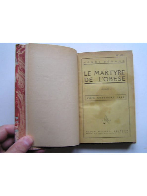 Ce roman fut à l'origine une nouvelle frivole, de commande, qui se charpenta et devint volumineuse; elle obtint, en 1922, le prix Goncourt avec un autre roman, plus sérieux, ˮLe vitriol de luneˮ. C'est l'histoire d'un ˮgrosˮ tombé amoureux d'une femme, belle mais sotte, qui quitte son mari qui la trompe. Le narrateur raconte ses amours contrariés avec humour sans trop se prendre au sérieux. En fait, tout en restant léger et un peu superficiel, ce roman n'est pas aussi négligeable que certains le pensent. Il est écrit dans une belle langue, bien française, et les réflexions qu'il suscite sont souvent très subtiles. ˮLe Martyre vaut bien mieux que sa réputation de pochade humoristiqueˮ (Francis Bergeron). Exemplaire établi dans une modeste reliure en demi-cuir brun bien usagée et frottée en coiffes et aux mors (le mors du dernier plat est fendu en tête sur 2cm); le cartonnage est frotté aux franges et aux coins. Intérieur bien propre même si le papier est un peu jauni.