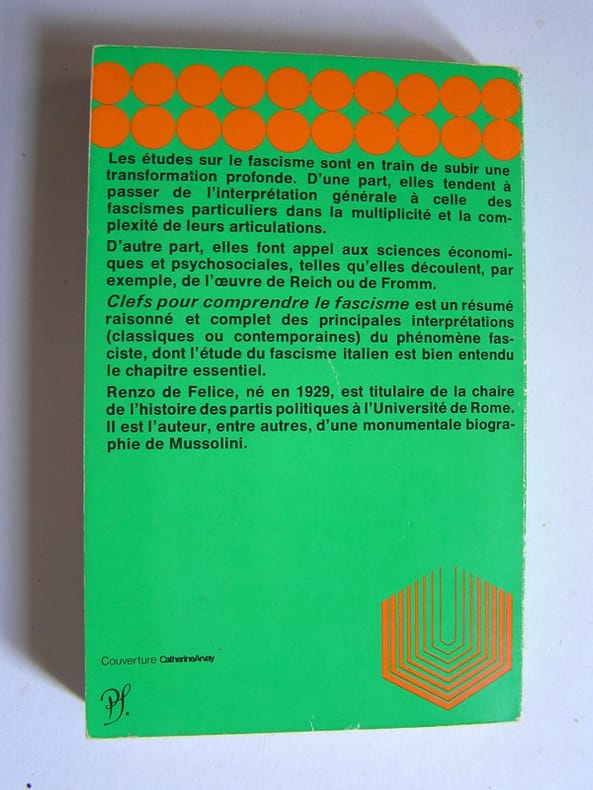 Traduit de l'italien par Marc Baudouy. ˮCet ouvrage est un résumé raisonné et complet des principales interprétations (classiques ou contemporaines) du phénomène fasciste, dont l'étude du fascisme italien est bien entendu le chapitre essentiel.ˮ Par un historien titulaire de la chaire de l'histoire des partis politiques à l'Université de Rome qui, dans les années 1950, adhérait au parti Communiste et qui s'en ait éloigné suite à la repression soviétique en Hongrie en 1956.