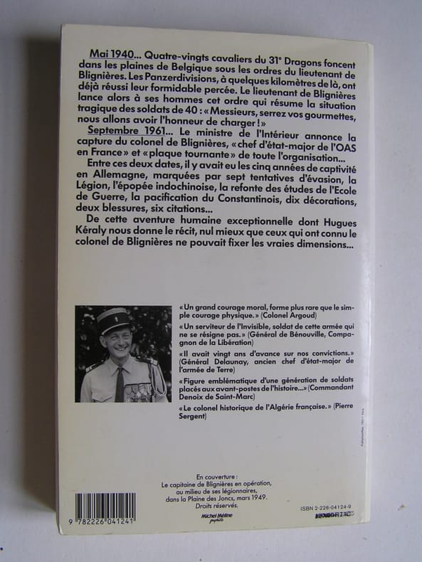 Un ouvrage consacré à Hervé de Blignières, saint-cyrien de la promotion du maréchal Lyautey, officier de cavalerie ayant chargé des chars en 1940, prisonnier aux nombreuses tentatives d'évasion, ancien combattant d'Indochine et d'Algérie, chef de corps du 1er R.E.C. (1958-1960), « chef d'état-major de l'OAS en France » et catholique à la foi profonde. — "Mai 1940... Quatre-vingts cavaliers du 31e Dragons foncent dans les plaines de Belgique sous les ordres du lieutenant de Blignières. Les Panzerdivisions , à quelques kilomètres de là, ont déjà réussi leur formidable percée. Le lieutenant de Blignières lance alors à ses hommes cet ordre qui résume la situation tragique des soldats de 40 : « Messieurs, serrez vos gourmettes, nous allons avoir l'honneur de charger ! » Septembre 1961... Le ministre de l'Intérieur annonce la capture du colonel de Blignières, « chef d'état-major de l'OAS en France » et « plaque tournante » de toute l'organisation... Entre ces deux dates, il y avait eu les cinq années de captivité en Allemagne, marquées par sept tentatives d'évasion, la Légion, l'épopée indochinoise, la refonte des études de l'Ecole de Guerre, la pacification du Constantinois, dix décorations, deux blessures, six citations... De cette aventure humaine exceptionnelle dont Hugues Kéraly nous donne le récit, nul mieux que ceux qui ont connu le colonel de Blignières ne pouvait fixer les vraies dimensions..." (4e de couverture)