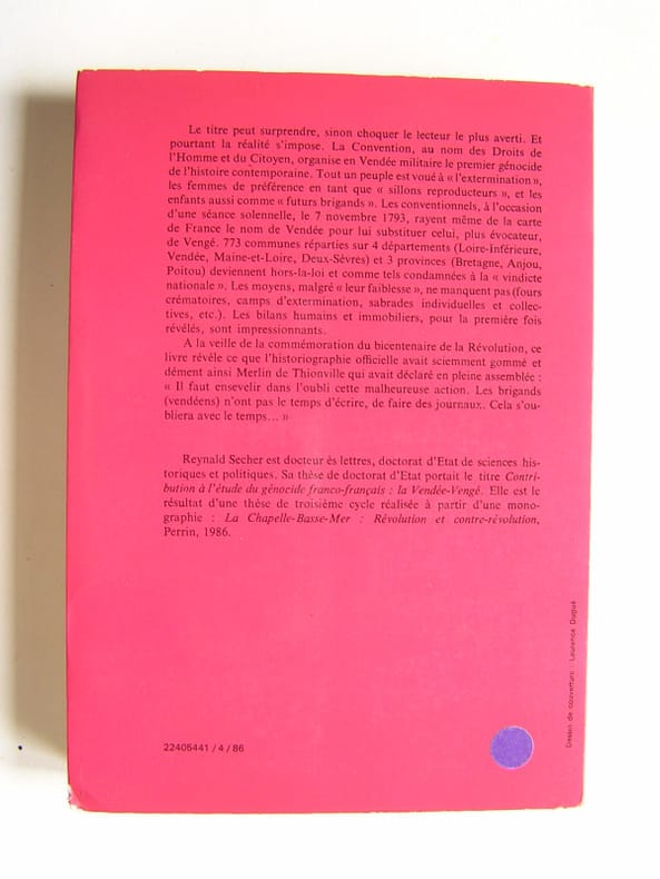 "Le titre peut surprendre, sinon choque le lecteur le plus averti. Et pourtant la réalité s'impose. La Convention, au nom des Droits de l'Homme et du Citoyen, organise en Vendée militaire le premier génocide de l'histoire contemporaine. Tout un peuple est voué à «l'extermination», les femmes de préférence en tant que «sillons reproducteurs», et les enfants aussi comme «futurs brigands». Les conventionnels, à l'occasion d'une séance solennelle, le 7 novembre 1793, rayent même de la carte de France le nom de Vendée pour lui substituer celui, plus évocateur, de Vengé. 773 communes réparties sur 4 départements (Loire-Inférieure, Vendée, Maine-et-Loire, Deux-Sèvres) et 3 provinces (Bretagne, Anjou, Poitou) deviennent hors-la-loi et comme tels condamnées à la «vindicte nationale». Les moyens, malgré leur faiblesse», ne manquent pas (fours crématoires, camps d'extermination, sabrades individuelles et collectives, etc.). Les bilans humains et immobiliers, pour la première fois révélés, sont impressionnants. A la veille de la commémoration du bicentenaire de la Révolution, ce livre révèle ce que l'historiographie officielle avait sciemment gommé et dément ainsi Merlin de Thionville qui avait déclaré en pleine assemblée: «Il faut ensevelir dans l'oubli cette malheureuse action. Les brigands (vendéens) n'ont pas le temps d'écrire, de faire des journaux. Cela s'oubliera avec le temps"
