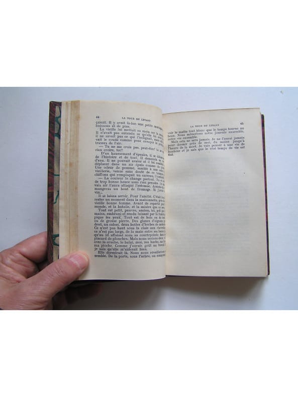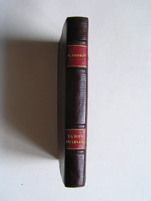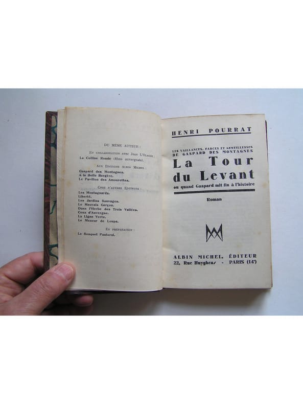 Quatrième et dernière partie du grand roman d'Henri Pourrat: Les vaillances, farces et gentillesse de Gaspard des Montagnes. ˮAvec La Tour du Levant, la lente passion arrive à sa crise: des coupsde force ou de ruse, jetant les personnages les uns cotre les autres, les contraignent d'obéir à leur âme et, selon son génie, Gaspard met fin à l'histoire.ˮ (Gandilhon Gens-D'armes) Edition sd (sans doute année de la première édition) établi dans une reliure demi-cuir à gros grain long maron foncé, dos à quatre nerfs avec pavés titre-auteur or en cuir rouge, en bon état (franges des plats un peu frottées). intérieur bien propre (Tranche de tête légèrement salie et pages légèrement jaunies). Un ancien propriétaire à collé en fin de volume un long article du critique littéraire Camille Gandilhon Gens-D'Armes.