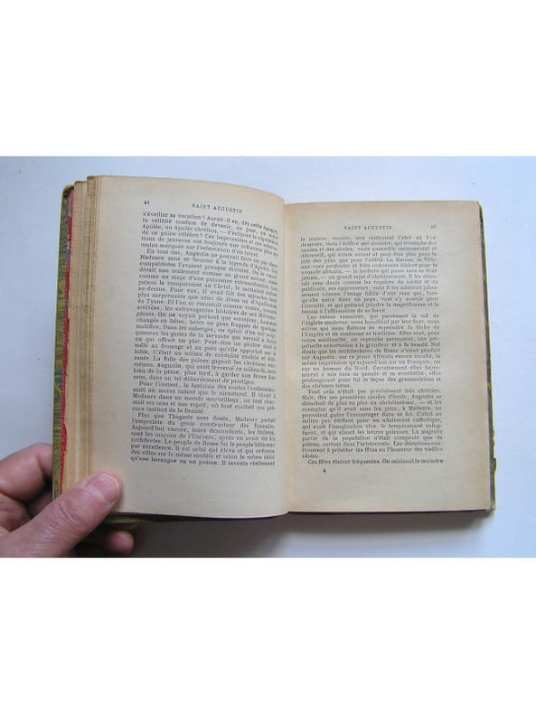 «Scrutateur des abîmes et des contradictions du cœur humain, Louis Bertrand se révèle un peintre incomparable. J’ai succombé au charme d’une écriture talentueuse et c’est avec un vrai bonheur que j’ai poursuivi ma lecture de sa biographie passionnante, véritable histoire écoutée aux portes de la légende.» (Cardinal Paul Poupard) La biographie du grand Saint de l'Afrique du Nord écrit par un auteur converti au Catholicisme et très attaché à l'Afrique du Nord où il a été professeur au lycée d'Alger. ˮSa biographie d’un des plus illustres Pères de l’Église fait revivre avec bonheur le passé chrétien de l’Algérieˮ (Frédéric Pons dans Valeurs Actuelles 2014) Réédition de 1931 (la première parution en de 1913) établi dans une agréable reliure en demi-basane fauve, dos à cinq nerfs avec pavés auteur et titre or, tranche de tête dorée, en plutôt bon état ( coiffes et franges de la reliure frottées). Intérieur bien propre (une date et une signature en haut de la page de faux-titre).
