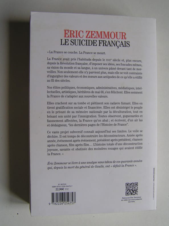 État : Très bon état - Année : 2014 - Format : in 8° - Pages : 534pp - Editeur : Albin Michel - Lieu d'édition : Paris - Type : Broché - Commander rapidement : https://www.bons-livres.fr/livre/eric-zemmour/9733-le-suicide-francais?lrb