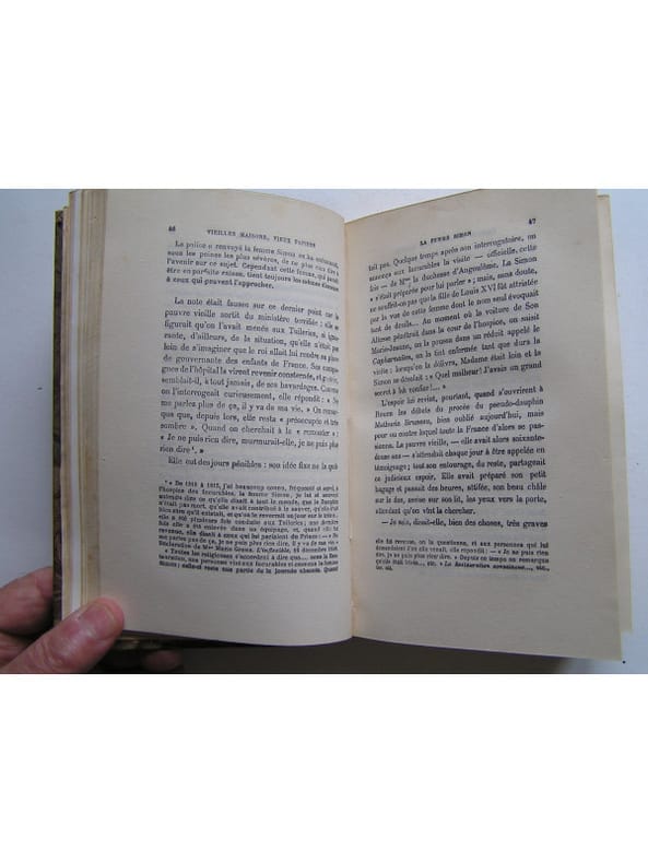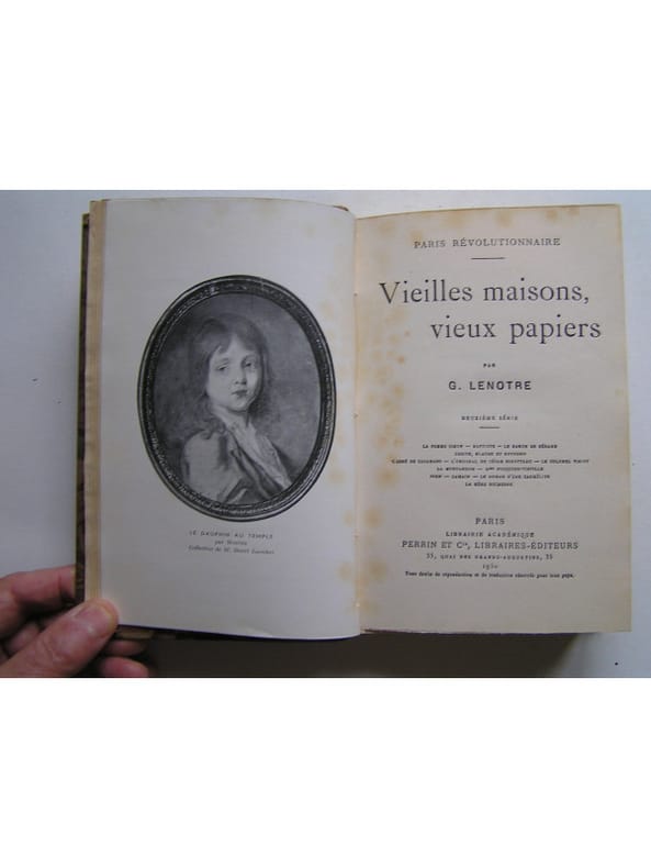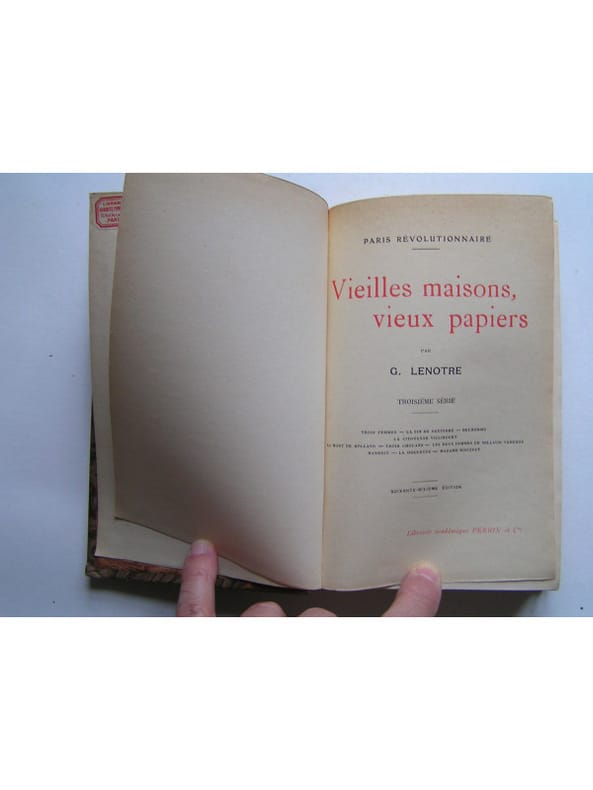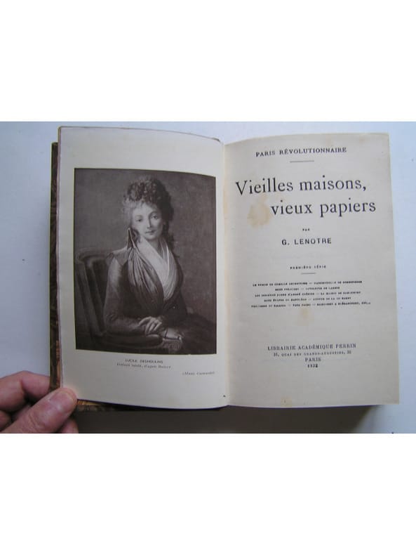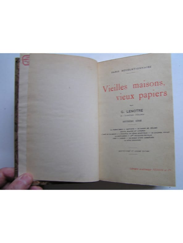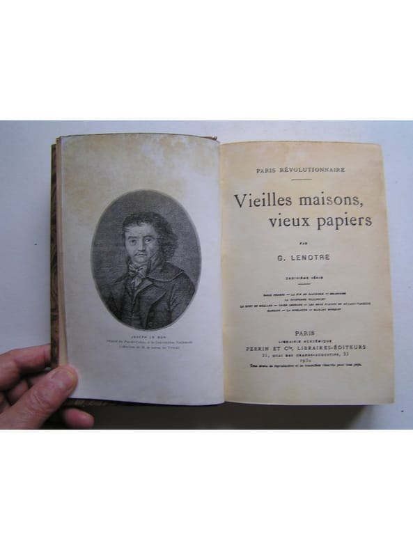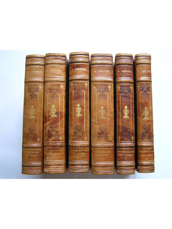 En adoptant ce titre pour la série de ses volumes sur l'histoire révolutionnaire, G. Lenotre a tout à la fois précisé ses intentions et révélé ses méthodes. Les historiens sont accoutumés à compulser de vieux papiers, ils ne sont pas toujours en quête de vieilles maisons. G. Lenotre a introduit le soucis du décor authentique dans la reconstitution du passé. L'ensemble est complet des six séries parues entre 1929 et 1932. L'édition proposée date de 1932 pour la première série, 1930 pour la seconde, la troisième et la quatrième, 1929 pour la cinquième et 1930 pour la dernière. Elle est bien établie dans une agréable reliure en demi-veau marbré fauve (premiers plats de couv conservés) à six nerfs avec auteur, titre et motis or (voir photos). Tranches de tête dorées. L'ensemble est globalement en bon état pour les reliures (frottements aux coiffes, aux coins et plus marqués aux mors). Toutefois: Tome 1 et tome 2- Qqes très rares rousseurs dans les marges sinon intérieur bien propre. Tome 3 et tome 4 - De pâles rousseurs sur les illustrations et sur les pages ˮmiroirsˮ . Tome 5 - Manque la page de titre et l'illustration en frontispice. Quelques pointes de rousseurs sur la tranches de gouttière, les illustrations et en mage de quelques pages.