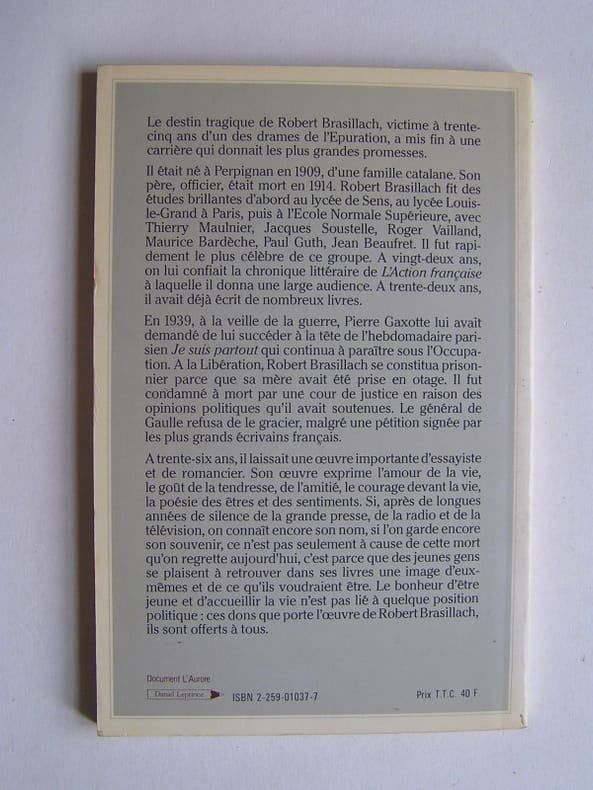 Seizième édition de 1983 chez Plon (cf Alain de Benoist) reprise de l'édition de 1949 ( Les Sept Couleurs, première édition officielle) des célèbres poèmes du poète fusillé à la Libération. ˮSeigneur voici couler le sang de la patrie. J'entends le bruit qu'il fait en tombant sur la terre, Le bruit sourd, en cinq ans de luttes ennemies, De ces gouttes tombant du corps de tant de frères.ˮ