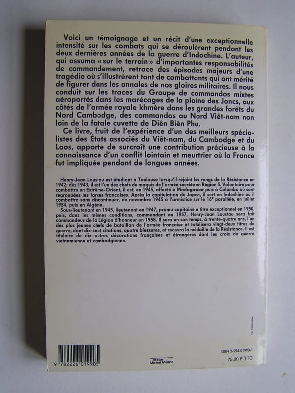 L'auteur a servi en Indochine sans discontinuer de novembre 1945 à juillet 1954. Il nous conduit sur les traces du Groupe de commandos mixtes aéroportés dans les marécages de la plaine des Joncs (Opération Choc en juillet 1952), aux côtés de l'armée royale khmère dans les grandes forêts du Nord Cambodge en 1953, avec les commandos au Laos et au Nord Viêt-nam (Opérations Condor et Albatros en mai-juin 1954, mises sur pied pour tenter de porter secours aux rescapés de Dien Bien Phu). — "Voici un témoignage et un récit d'une exceptionnelle intensité sur les combats qui se déroulèrent pendant les deux dernières années de la guerre d'Indochine. L'auteur, qui assuma "sur le terrain" d'importantes responsabilités de commandement, retrace des épisodes majeurs d'une tragédie où s'illustrèrent tant de combattants qui ont mérité de figurer dans les annales de nos gloires militaires. Ils nous conduit sur les traces du Groupe de commandos mixtes aéroportés dans les marécages de la plaine des Joncs, aux côtés de l'armée royale khmère dans les grandes forêts du Nord Cambodge, des commandos au Nord Viêt-nam non loin de la fatale cuvette de Diên Biên Phu. Ce livre, fruit de l'expérience d'un des meilleurs spécialistes des Etats associés du Viêt-nam, du Cambodge et du Laos, apporte de surcroît une contribution précieuse à la connaissance d'un conflit lointain et meurtrier où la France fut impliqué pendant de longues années."