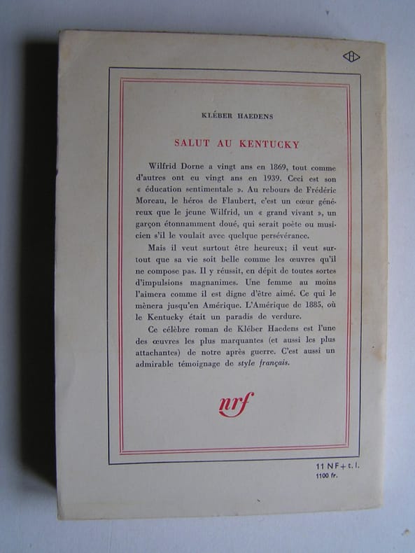 ˮWilfrid Dorne a vingt ans en 1869. C'est un cœur généreux, un garçon étonnamment doué, qui serait poète ou musicien s'il le voulait avec quelque persévérance. Mais il veut surtout être heureux; il veut surtout que sa vie soit belle. Il y réussit, en dépit de toutes sortes d'impulsions magnanimes. Une femme au moins l'aimera. Ce qui le mènera jusqu'au Kentucky, un paradis de verdure.ˮ Réédition en 1960 par Gallimard d'un livre de 1947. ˮCe célèbre roman de Kléber Haedens est l'une des œuvres les plus marquantes (et aussi les plus attachantes) de notre après-guerre. C'est aussi un admirable témoignage de style français.ˮ ˮRoman considéré à juste titre comme son chef-d'oeuvre, est un récit haletant, brutal et brûlant, d'une vertuosité inouïe. Lire salut au kentucky, c'est découvrir l'importance d'un écrivain très original et d'un extrême pouvoir de séduction.ˮ (Eric Lestrient)