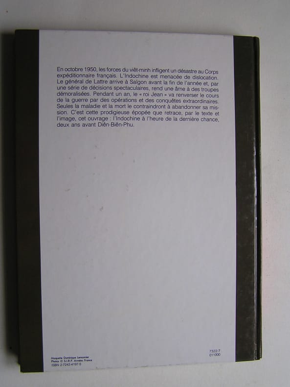 En octobre 1950, les forces du viêt-minh infligent un désastre au corps expéditionnaire français. L'Indochine est menacée de dislocation. Le général de Lattre arrive à Saïgon et, par une série de décisions spectaculaires, rend une âme à des troupes démoralisées. Pendant un an, le ˮroi Jeanˮ va renverser le cours de la guerre par des opérations et des conquêtes extraordinaires. C'est cette prodigieuse épopée que retrace cet ouvrage, par le texte, clair et précis,et par l'image, des photographie prises sur le vif à la fois réalistes et émouvantes. L'Indochine a l'heure de la dernière chance, deux ans avant Diên-Biên-Phu.
