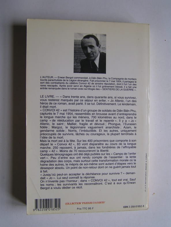 Le calvaire des soldat français prisonniers après la bataille de Diên Biên Phu est ici raconté à travers le martyre des 400 hommes du convoi ˮ42ˮ. Tout est vrai sauf les noms. 70 hommes seulement recouvriront la liberté; 83 vont disparaître au cours de la longue marche et 250 reposent à jamais dans les fondrières de l'effroyable camp ˮ42ˮ. ˮUn livre hallucinant, pathétique, presque intolérable...C'est un récit, une chronique de l'horreur, du desespoir, traversé de fulgurantes lueurs de courage et d'honneur... ˮConvoi 42ˮ est un livre qui fait mal au coeur et à la raison.ˮ Pierre Darcourt. A lire avec ˮLe manifeste du camp n°1ˮ de Jean Pouget.