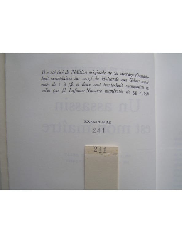 461 – MONTHERLANT Henry de : Un assassin est mon maître. Gallimard Paris 1971. E.O. L’un des 238 ex. sur Pur fil, 2ème papier. Broché in-8, état de neuf –