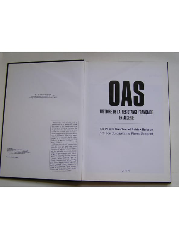 Préface du capitaine Pierre Sergent. ˮCet ouvrage a été réalisé à partir de témoignages et de documents venant des acteurs et des témoins directs du combat pour l'Algérie française.ˮ Un album richement illustré de photographies et documents d'époque et, en fin de volume ˮLes plus beaux textes de l'Algérie françaiseˮ avec les témoignages des principales personnalités proches de l'OAS Première édition de 1983. Les auteurs se garde bien de faire l'apologie de l'OAS dans tous ses aspects mais ils se donnent comme mission de rendre hommage aux combatants et d'expliquer les raisons qui ont poussées des hommes, souvent ˮordinairesˮ, a s'engagé dans un combat pour l'Honneur. Ce livre est une oeuvre de justice en racontant simplement est leur histoire. Il appartient au lecteur de se faire une opinion.