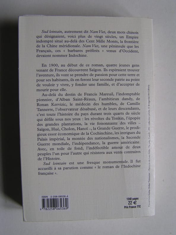 En 1900, quatre jeunes gens venant de France découvrent Saïgon. Ils espéraient trouver l'aventure, ils vont se prendre de passion pour cette terre et pour ses habitants. La grande guerre, le prodigieux essor économique de la Cochinchine, les inrigues du palais impérial, la montée des nationalismes, la guerre et l'indépendance. Cet amour de deux peuples l'un pour l'autre. La série complète, en un seul volume, de cette saga indochinoise: Le courrier de Saïgon; La rivière des parfums; Le maître de Bao Tan. ˮFaites un saut de (plus de 1200 pages) dans le passé et rejoingnez à Marseille, où ils s'embarquent sur le courrier de Saïgon, les héros de Sud Lointain... Tout dans ce livre, est pleinement maîtrisé: une intrigue dense et riche en rebondissements, des caractères solidement campés et travaillés, ce qu'il faut de noble sentiments et de situations romanesques, la juste dose d'exotisme, de souffrance, d'amour et de mort.ˮ (Anne Bernet, Aspect de la France)