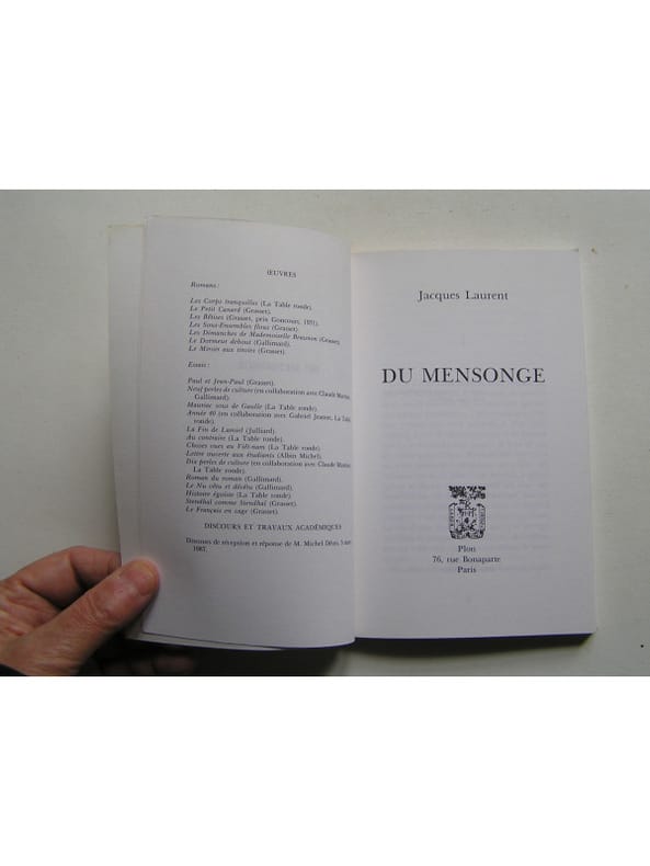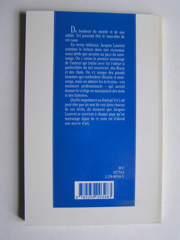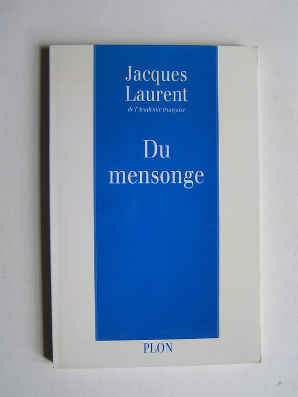 État : Très bon état - Année : 1993 - Format : in 12° - Pages : 110pp - Editeur : Plon - Lieu d'édition : Paris - Type : Broché - Commander rapidement : https://www.bons-livres.fr/livre/jacques-laurent/10447-du-mensonge?lrb