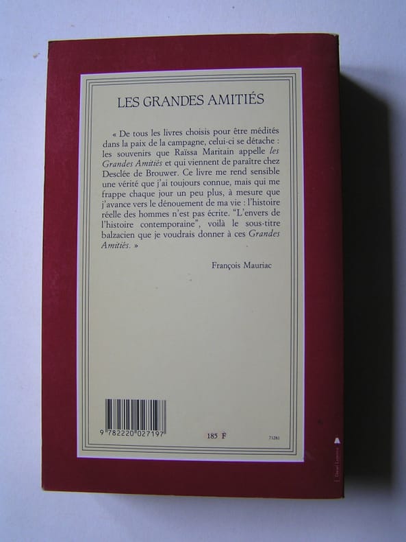 Rédition de 1993 en un seul volume de deux livres , ˮLes grandes amitiésˮ et ˮLes aventures de la Grâceˮ, parus initialement en 1941 et 1944 à New-York qui reçu le prix du ˮRenouveau Françaisˮ en 1948. Préface de François Mauriac (éditorial du Figaro de 1948). Raïssa Maritain retrace dans ce livre ses années d'enfance, de jeunesse et le trajet spirituel qu'elle et Jacques Maritain ont suivi à travers l'enseignement de leurs maîtres et l'affection de leurs grands amis de ce temps, Henri Bergson, Ernest Psichari, Georges Rouault, Léon Bloy... «L'histoire de Jacques et Raïssa Maritain, ce serait peu de choses si elle n'était que l'histoire de très belles intelligences: qu'ils soient l'un et l'autre comblés des dons de l'esprit, cela est indéniable, mais enfin nullement exceptionnel. Qu'ils aient reçu la grâce de la conversion dans les circonstances que raconte ce livre n'offre rien non plus qui rende leur aventure différente de beaucoup d'autres. Mais ceci leur est particulier: à travers tant d'années et tant d'épreuves, la fidélité à leur vocation; cette fidélité a fait de leur modeste maison l'un des centres de vie spirituelle les plus féconds peut-être de France et même d'Europe. Chez eux, la connaissance tourne à l'amour: l'ordre de l'esprit rejoint l'ordre de la charité, voilà le secret de tout; car qui dit fidélité, dit charité.» François Mauriac (Le Figaro, 11-12juillet 1948).