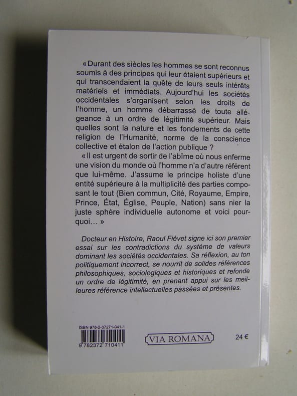 L'auteur, Docteur en Histoire, nous livre un essais sur les contradictions du système de valeurs dominant les sociétés occidentales en s'appuyant sur de solides références philosophiques, sociologiques et historiques et propose un autre logiciel de valeurs fondées sur les des principes transcendantes qui sont supérieures. En fait, une critique de l'individualisme comtemporain qui met les droits de l'individu au-dessus de toute contrainte et toute allégeance à un ordre de légitimité supérieur. L'auteur propose de révenir au principe ˮholiste d'une entité supérieures à la multiplicité des parties composant le tout (Bien commun, Cité, Royaume, Empire, Prince, Etat, Eglise, Peuple, Nation)ˮ. On peut ne pas être en accord avec l'auteur mais il faut reconnaître que les arguments sont étayés et référencés.
