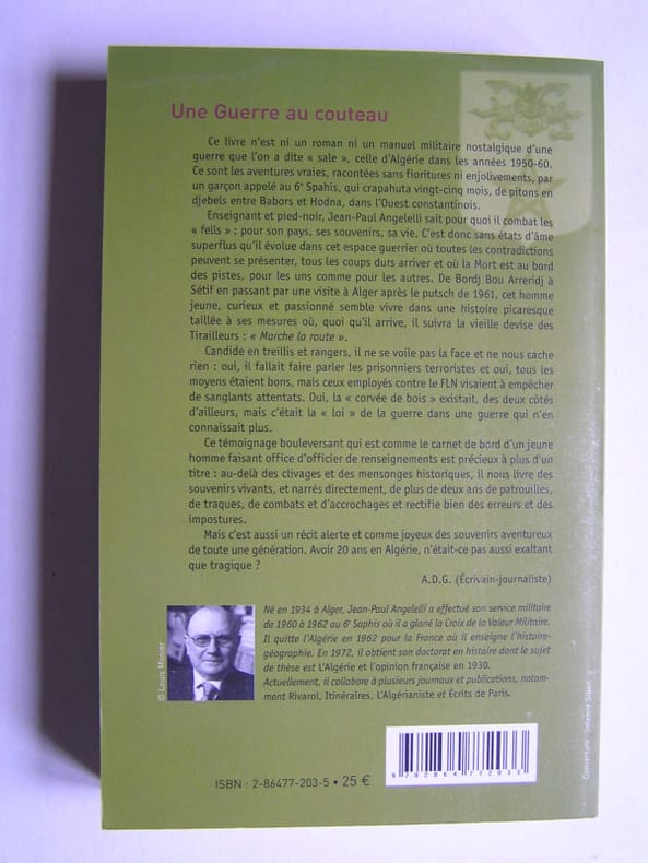 Un témoignage d'appelé comme les autres! Pas tout à fait: c'est un pied-noir attaché vicéralement à sa terre; l'auteur ne regrette rien dans l'apreté des combats et dans la rigeur de la recherche du renseignement; enfin, après s'être battu jusqu'au bout pour garder l'Algérie à la France, il reste fidèle à ce souvenir. Un livre écrit en 1965 et publié en 2004! ˮAu-delà des clivages et des mensonges historiques, il nous livre des souvenirs vivants, et narrés directement, de plus de deux ans de patrouilles, de traques, de combats et d'accrochages et rectifie bien des erreurs et des impostures.ˮ (A.D.G.)
