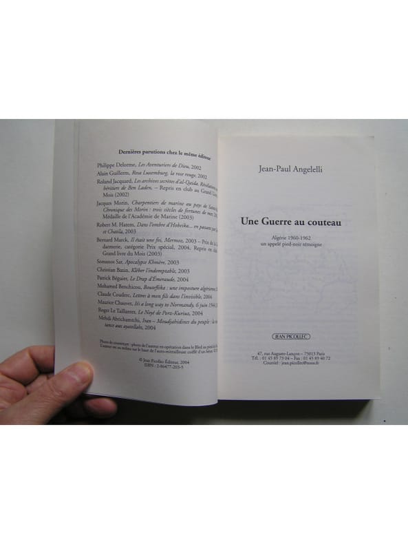 État : Bon état - Année : 2004 - Format : in 8° - Pages : 333pp - Editeur : Jean Picollec - Lieu d'édition : Paris - Type : Broché - Divers : Un pli de lecture au dos mais ouvrage bien solide. Coins du premier plats de couv légèrement cornés. Intérieur bien propre. - Commander rapidement : https://www.bons-livres.fr/livre/jean-paul-angelelli/10465-une-guerre-au-couteau-algerie-1960-1962-un-appele-pied-noir-temoigne?lrb
