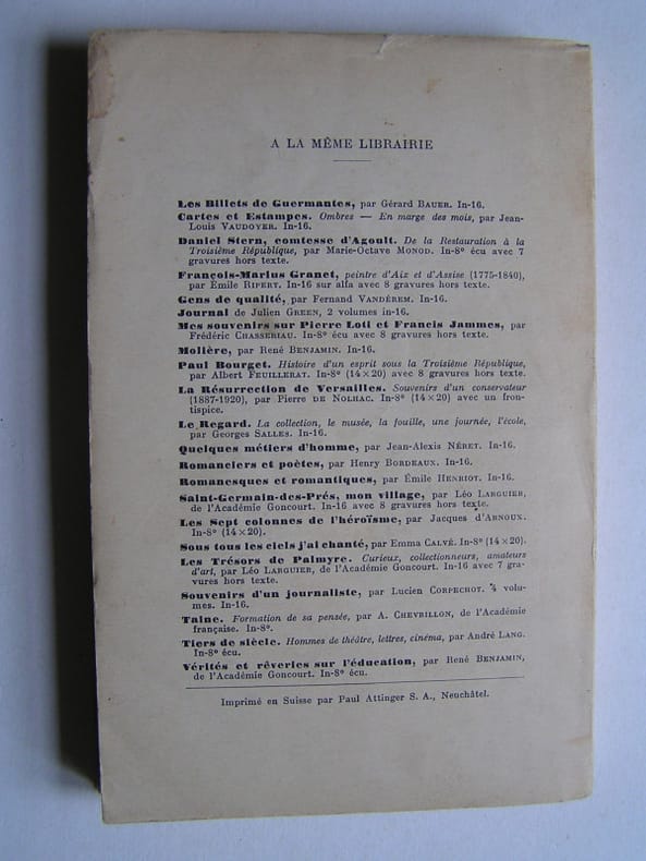 Plon. 1937. In-12. Broché. Etat d'usage, Couv. légèrement passée, Dos plié, Papier jauni. 264 pages.. . . . Classification Dewey : 846-Lettres, correspondance littéraire