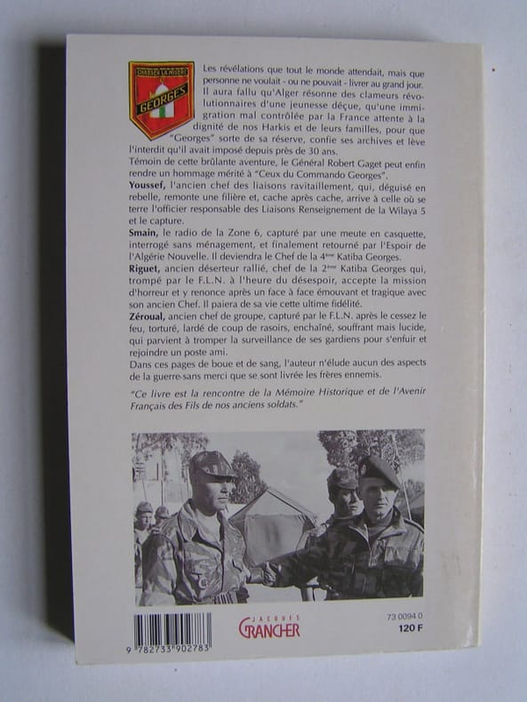 L'histoire du ˮCommando Georgesˮ créé par le lieutenant Grillot sous le commandemant de Bigeard pour avec d'anciens FLN devenus harkis traquer les katibas dans le secteur de Saïda. Les résultats furent exemplaires mais la fin, alors que l'Algérie acquière son indépendance, est tragique. L'auteur, commadant un commandos frère Cobra, raconte leur histoire et leur rend hommage. Un livre bien documenté (archives et confidences du général Grillot?) écrit avec la compétence du soldat et le coeur du chef, richement illustré de photographies et de croquis d'opérations.