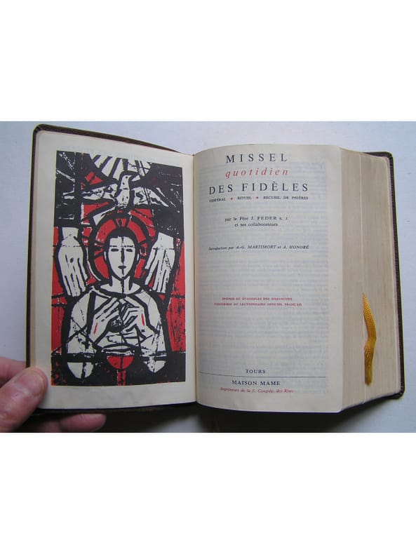 Maison Mame. 2 février 1957. In-16. Relié. Bon état, Couv. convenable, Dos frotté, Intérieur frais. 1485 pages. Papier Bible. Titre doré sur pièce de titre. Reliure en skivertex de couleur noire. Signet. Décors repoussés sur plats.. . . . Classification Dewey : 264-Le culte