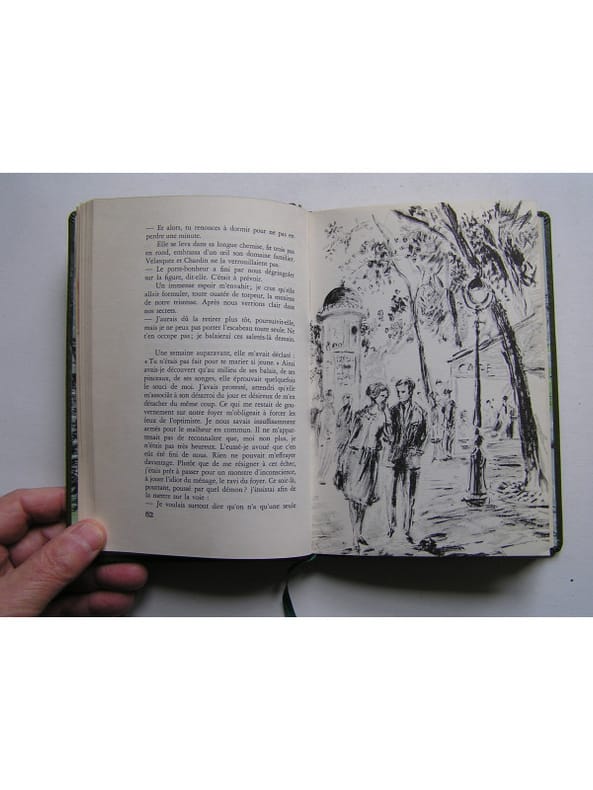 «Là où nous habitons, les avenues sont profondes et calmes comme des allées de cimetière. Les chemins qui conduisent de l'École militaire aux Invalides semblent s'ouvrir sur des funérailles nationales. Un trottoir à l'ombre, l'autre au soleil, ils s'en vont entre leurs platanes pétrifiés, devant deux rangées de façades contenues, sans une boutique, sans un cri.» L'histoire d'un petit professeur d'histoire qui, las d'une petite vie bourgeoise, retrouve son grand amour de jeunesse et l'aventure de la vie. Le deuxième roman d'Antoine Blondin écrit en 1952 et édité par La Table Ronde dans la période où il donne dans la polémique politique et la bohème. Dans une agréable édition club imprimée à 3000 exemplaires numéroté (n°1465) rélié en simili-cuir vert avec motifs or et illustré par Paulette Debraine.