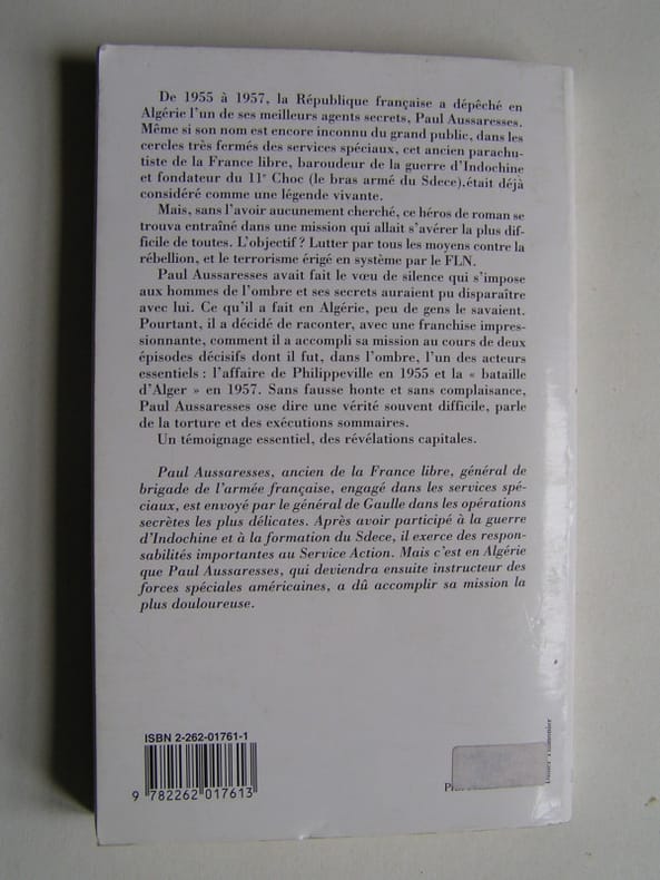 Perrin Sans date. Le général Paul Aussaresses ancien résistant et agent des services secrets relate son rôle central dans la bataille d'Alger (1957) et les opérations spéciales en Algérie entre 1955 et 1957. Son livre publié en 2001 revendique et décrit complaisamment l'usage de la torture et des exécutions sommaires relançant un débat douloureux sur les méthodes de la République française pendant la guerre