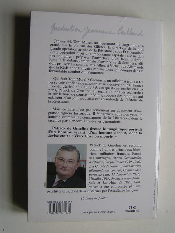 A travers la personnalité exceptionnelle de son chef, le lieutenant Tom Morel, c'est toute l'histoire du maquis des Glières que nous raconte Patrick de Gmeline à partir de documents souvent inédits. Autour de l'encadrement du 27e Bataillon de Chasseurs alpins reconstitué dans la clandestinité 500 maquisards furent opposé à 12000 soldats de la Wehrmacht du 12 au 26 mars 1944. Préface de Nicolas Sarkozy. 16 pages de photos. «D'où lui venait cette force? Sans doute de son énergie naturelle, qui était impressionnante, de son caractère intrépide et fougueux. Mais elle tenait aussi à un idéal de générosité et de sacrifice, qui était le fruit conscient et voulu de sa foi: «Priez, écrivait-il un jour au prêtre qui était son confident, pour que je garde jusqu'au bout, au milieu des difficultés comme au centre du bonheur et des joies de la famille, cette âme qui répugne à la médiocrité et qui voudrait s'élever toujours dans la noblesse... D'un bout à l'autre de sa vie de soldat, Tom aura été porté par ce vœu, qui est le vœu du véritable héroïsme.» (Pierre Golliet