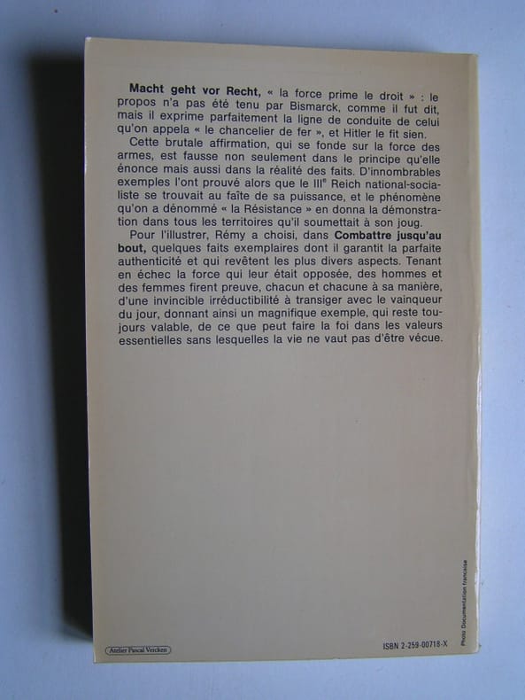 "Macht geht vor Recht , « la force prime le droit » : Le propos n’a pas été tenu par Bismarck, comme il lui fut dit, mais il exprime parfaitement la ligne de conduite de celui qu’on appela « le chancelier de fer », et Hitler le fit sien. Cette brutale affirmation, qui se fonde sur la force des armes, est fausse non seulement dans le principe qu’elle énonce mais aussi dans la réalité des faits. D’innombrables exemples l’ont prouvé alors que le IIIe Reich national-socialiste se trouvait au faîte de sa puissance, et le phénomène qu’on a dénommé « la Résistance » en donna la démonstration dans tous les territoires qu’il soumettait à son joug. Pour l’illustrer, Rémy a choisi, dans « Combattre jusqu’au bout », quelques faits exemplaires dont il garantit la parfaite authenticité et qui revêtent les plus divers aspects. Tenant en échec la force qui leur était opposée, des hommes et des femmes firent preuve, chacun et chacune à sa manière, d’une invincible irréductibilité à transiger avec le vainqueur du jour, donnant ainsi un magnifique exemple, qui reste toujours valable, de ce que peut faire la foi dans les valeurs essentielles sans lesquelles la vie ne vaut pas d’être vécue." (4e de couverture) Désormais les frais d'envoi sont de 6 € seulement pour les livres jusqu'à 1 kg (colissimo suivi), pour la France métropolitaine.