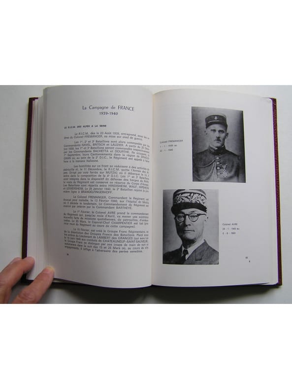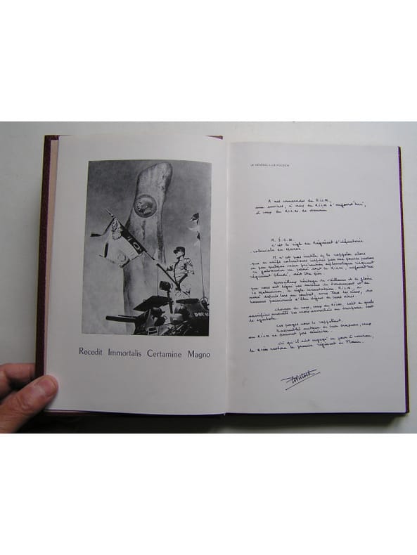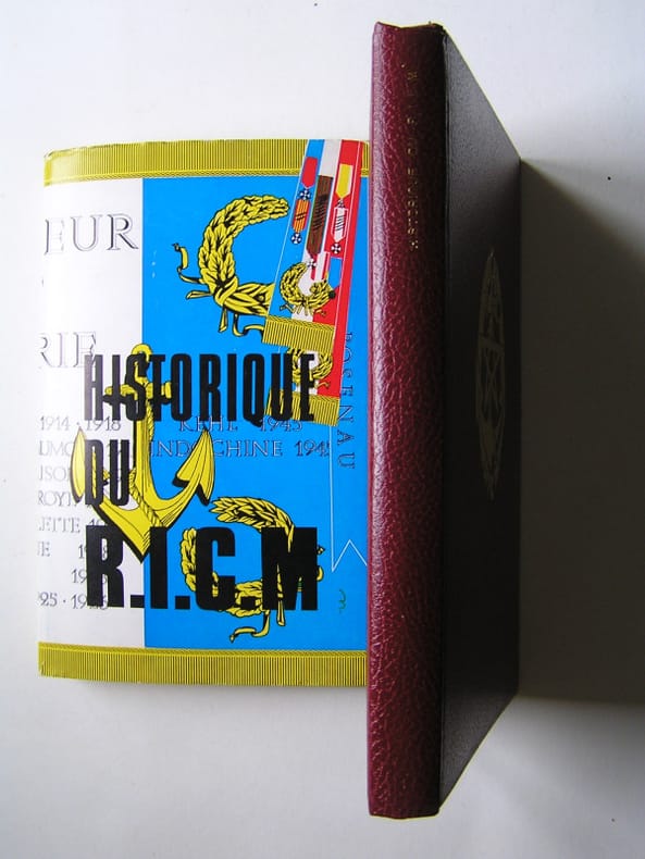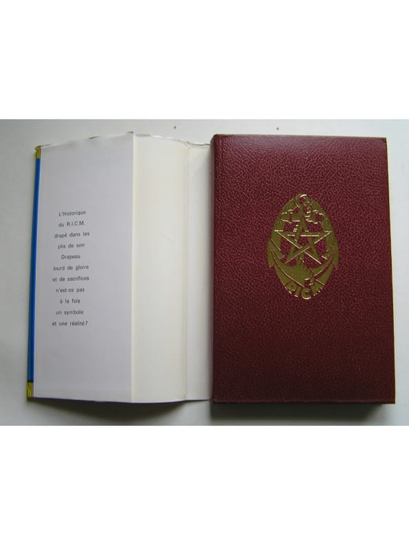 Cet ouvrage à été réalisé par les soins du R.I.C.M. Edité sous l'égide de l'Association nationale des Anciens Combattants et Anciens du R.I.C.M. Edition a tirage limité 2250 exemplaires numérotés dont 2000 sur papier ˮEdimatˮ (n°1842) constituant l'édition originale établie dans une reliure éditeur en skyvertex (façon maroquiné) rouge sous jaquette illustrée. Lettre (manuscrite) préface du général Le Puloch. Les campagnes du R.I.C.M. de sa création en août 1914 jusqu'à son arrivée en Bretagne à Vannes le 22 janvier 1963.