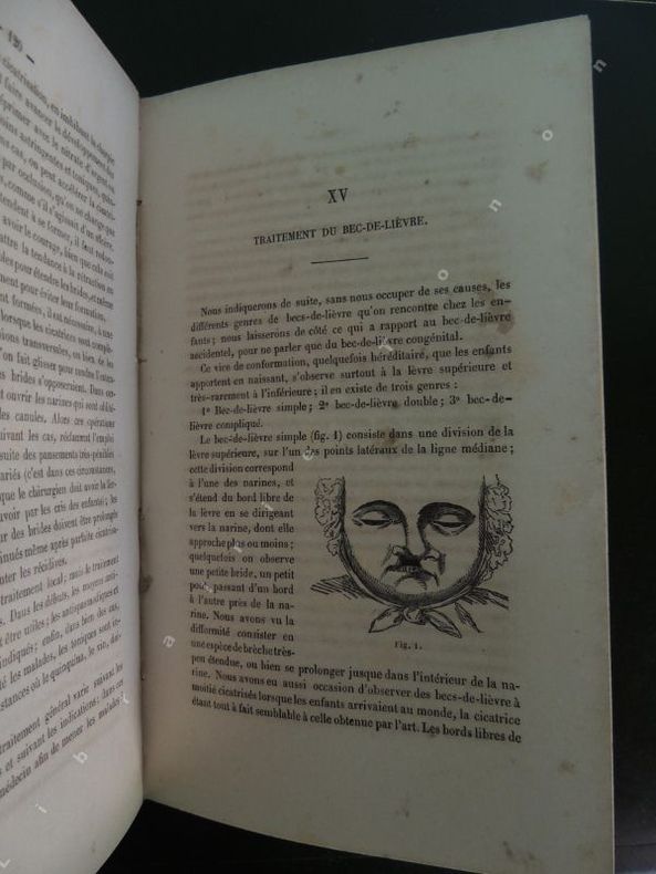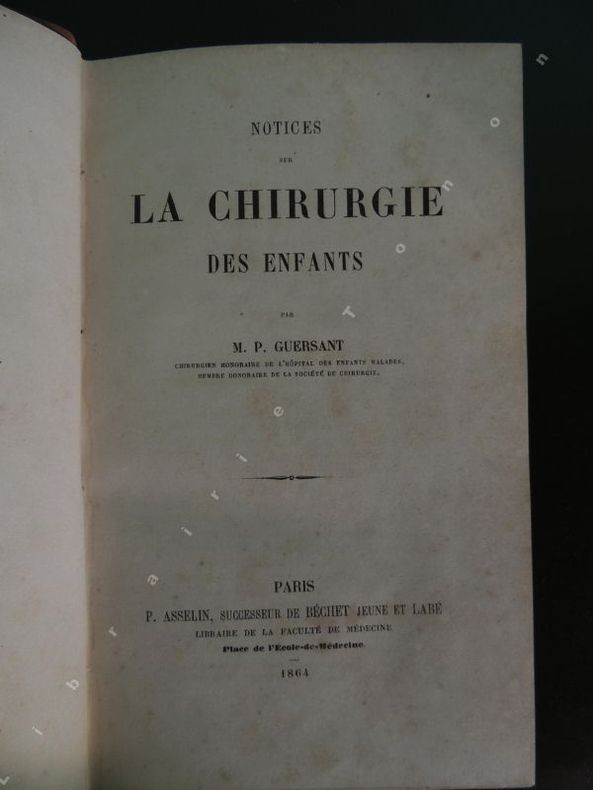 2 ff.n.ch. (faux-titre, titre), pp. [vii]-viii, 398 pp., 1 f.n.ch. (catalogue de l'éditeur).Première et unique édition. Fils et petit-fils de médecins, Paul Guersant (1800-1869) fut chirurgien à l'hôpital des Enfants-Malades, à Paris, où il donna des leçons cliniques de 1840 à 1860. Il présente ici, en 72 chapitres, de nombreux cas de chirurgie pédiatrique : adénites cervicales, phimosis, fractures, trachéotomie, hypertrophie des amygdales, tumeurs, calculs vésicaux, hydrocèle, arthrites chroniques, bec-de-lièvre, hernies abdominales, incontinence, pieds-bots, ostéite, luxations traumatiques, etc. Un chapitre est consacré à l'anesthésie, qui peut être générale ou locale.Bon exemplaire de cet ouvrage novateur