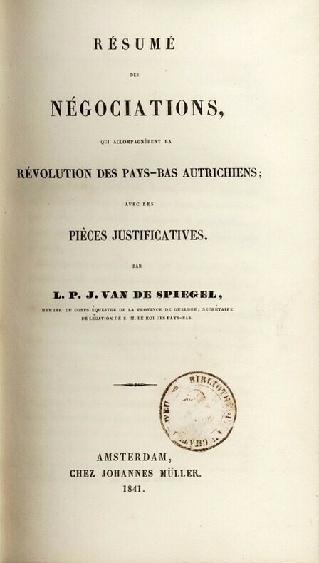 Edition originale en reliure romantique Édition originale sur papier vélin d'une intéressante histoire de la révolution brabançonne (ou révolution belge) qui, de 1787 à 1790, fit face au « despotisme éclairé » de Joseph II. Après un bref exposé des faits historiques, l'auteur s'attache, de manière tout à fait originale, à reproduire les documents des négociations diplomatiques qui accompagnèrent ces événements. Cette approche historiographique nous permet d'accéder à des documents précieux dont certains furent traduits pour la première fois par l'auteur. Curiosité : la page de titre porte le cachet découpé rapporté de la bibliothèque du roi Louis Philippe au château d'Eu. Dos et tête du plat supérieur insolés.
