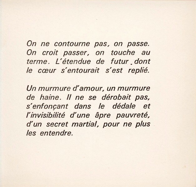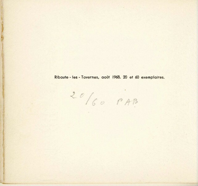 Ribaute-les-Tavernes, PAB, [août] 1968. 1 vol. (113 x 126 mm) non paginé, cousu. Édition originale. Tirage à 80 exemplaires -- les 20 premiers avec gouache de PAB. Un des 60 sur vélin de Rives, signé par PAB. n° 59.