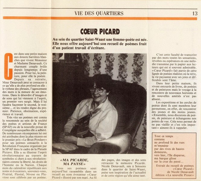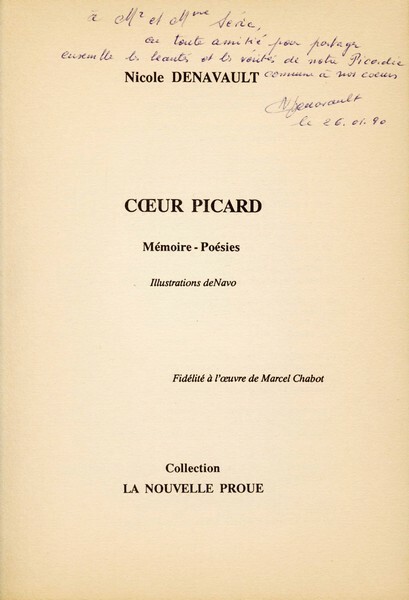 UNE POÉTESSE PICARDE ILLUSTRÉE PAR SON ÉPOUX. Édition originale et unique de ce recueil regroupant toutes les oeuvres de la poétesse picarde Nicole Denavault. Tirage limité à 200 exemplaires numérotés, celui-ci le n°24. Envoi autographe signé « à Mr et Mme Séric, / en toute amitié pour partager ensemble les beautés et les vérités de notre Picardie commune à nos coeurs / N. Devenault / le 26.01.90 » Publié par l'association « La nouvelle proue » (rendant hommage au poète Marcel Chabot directeur de la revue La Proue), l'ouvrage est illustré par l'époux de l'auteur, qui signe du pseudonyme DeNavo ornements, vignettes et compositions à pleine page. Certains des poèmes apparaissent manuscrits et reproduits par phototypie. « Ma Picarde, ma Payse / Mon âme ne peut t'aimer / qu'en sabots... » On relève notamment un cycle de poèmes sur la révolution française, organisés selon le calendrier républicain, récompensé par le premier prix « Le Brun-Pyndare ». L'exemplaire est truffé de 3 coupures de journaux : 1) Un article paru à la sortie de Coeur Picard et illustré d'un portrait de la poétesse, 2) Un poème de l'auteur paru sous le pseudonyme « Nicole de St Waast », 3) Un article annonçant le mariage de Catherine Denevault, événement auquel est consacré le poème « Alliance » (p. 12). Feuillet d'errata contrecollé à la première garde blanche. 1 seul exemplaire en bibliothèque : BnF Tolbiac. Coiffe supérieure appuyée.