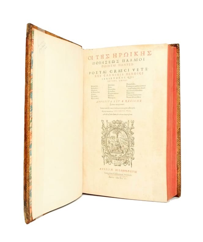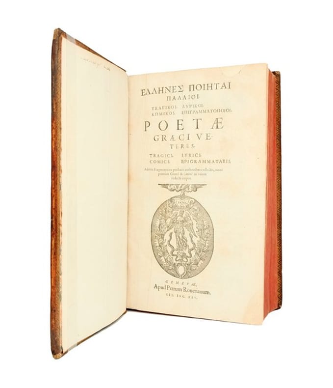UN RARE FLORILÈGE DE POÈTES GRECS BIEN COMPLET DE SES DEUX VOLUMES. Rare exemplaire, en reliure uniforme du XVIIIe siècle. Première édition bilingue gréco-latine (sur deux colonnes), de cette anthologie des poètes grecs. L'ouvrage constitue une précieuse synthèse des travaux d'analyse et de traduction effectués à la Renaissance sur les auteurs anciens. Les deux premiers volumes, consacrés aux poètes épiques, sont établis par Jacques Lect d'après le florilège grec du même titre compilé par Henri Estienne et publié pour la première fois en 1566 : on y trouve les oeuvres d'Homère, les Argonautiques orphiques, les oeuvres de Callimaque, Bion, Aratos de Soles, Nicandre (une pièce n'est présente qu'en grec, le compilateur n'en ayant pas trouvé une traduction latine satisfaisante), Denys le PÃrigÚte, Coluthos, Tryphiodore, Theognis, Apollonios de Rhodes, Oppien de Syrie, Quintus de Smyrne, Nonnos de Panapolis...Les volumes 3 et 4 sont consacrés aux tragédiens, auteurs de comédies et compositeurs d'épigrammes on y trouve leses oeuvres de Sophocle, Euripide, Eschyle, Aristophane, Ezechiel, Pindare, Manuel Philès, Georges de Pisidie, Jean Tzétzès, Clément d'Alexandrie, et plusieurs compilations. Les auteurs des traductions du grec en latin n'étant que rarement cités par les compilateurs, leurs sources mériteraient d'être étudiées plus avant. Une édition des tomes 1 et 2 parue à la même date porte au titre du premier volume l'adresse « Petrus de la Rouière » cette-dernière est presque en tous points identique, mais le feuillet (blanc ici) après la dédicace y est imprimé (avis au lecteur, « Poetarum Graecorum Lectoris »). Toutes deux portent in fine la mention « Execudebat Petrus de la Rouiere ». Provenance : Guy Rachet (né à Narbonne en 1930), écrivain. Ex-libris manuscrit moderne « Guy Rachet 1958 » à l'encre noire sur la première garde blanche du vol. 2. Notes au crayon et à l'encre bleue, principalement concentrées sur les pages 704-715 (Theognis) ; ces pages portent la mention « notes faites à Cannes en 1958-59 ». Historien et archéologue autodidacte, auteur de romans historiques, Guy Rachet spécialisé dans l'Égypte ancienne, publia également plusieurs ouvrages consacrés à la Grèce : Dictionnaire de la civilisation Grecque (1968), Archéologie de la Grèce préhistorique (1969), La Tragédie grecque (1973)... Mors fendus, coins arasés, manques aux coiffes du vol. 1 : quelques mouillures marginales, quelques feuillets roussis (principalement au vol. 2), galeries de xylophage sur quelques feuillets au second tome du vol. 1 ayant emporté quelques lettres.
