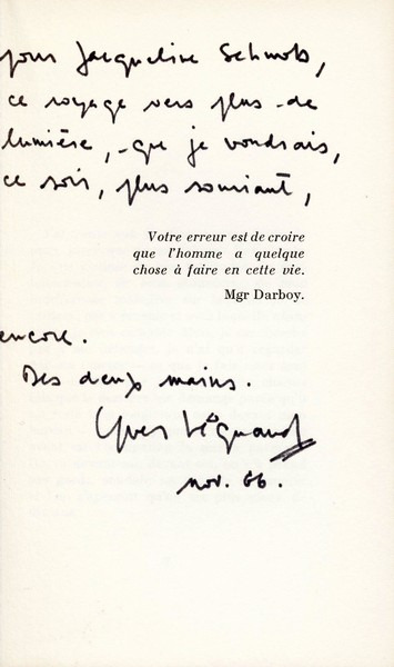 Édition originale. Envoi autographe signé : « Pour Jacqueline Schwob, / ce voyage vers plus de lumière, que je voudrais, ce soir, plus souriant, encore. / Des deux mains. / Yves Véquaud / Nov. 66 » Pour lutter contre le laisser-aller et l'anonymat du XXesiècle, le narrateur de ce roman entreprend un ambitieux projet d'écriture de soi. Yves Véquaud (1938-2000), romancier, fut traducteur des poèmes de Federico Garcia Lorca. Il également l'auteur d'une apologie du haschisch, d'abord publiée timidement sous le titre de Vive le haschisch ?, et aujourd'hui rééditée comme Vive le Haschich !!! Dos insolé.
