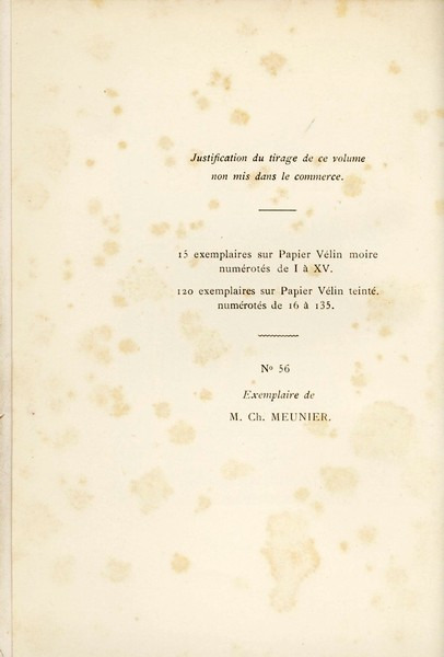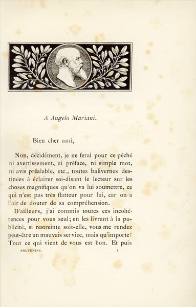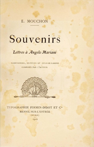 AU SUPRA-LIBRUM DU RELIEUR CHARLES MEUNIER. Édition privée tirée à 135 exemplaires hors commerce de ce recueil de lettres du graveur Eugène Mouchon à Angelo Mariani, « vulgarisateur de la coca ». Un des 120 exemplaires sur vélin-teinté (après 15 sur vélin moire) imprimé spécialement pour « M. Ch. Meunier » (n° 56). L'ouvrage est illustré par l'auteur de 2 autoportraits placés en frontispice (« M. E. Mouchon à sa table de graveur » et « M. E. Mouchon imprimant ses épreuves ») ainsi que de 29 culs-de-lampe et 38 bandeaux : le premier figure une médaille au profil de Mariani dans un décor de feuilles de coca. Sont réunies dans ce volume 37 lettres composées par Eugène Mouchon (1843-1914), prolifique graveur de billets de banque, de décor de médailles et de timbres (dont la célèbre série « Droits de l'homme » de 1900). Médaillé d'or à l'Exposition universelle de 1889, premier prix d'orfèvrerie en 1893, Mouchon avait travaillé pour plusieurs pays étrangers, notamment la Belgique, la Grèce et l'Éthiopie. La vieillesse le contraint cependant à une relative inaction : « L'outil n'obéit plus à la main, déjà moins sûre depuis que l'oeil ne la dirige plus avec la même précision qu'autrefois [...] je touche à tout et non seulement je ne fais rien de bon mais je fais de mal en pis » [p. 11]. L'artiste laisse donc sa pensée divaguer : de l'aviation à Napoléon, de la mélancolie des ruines aux Algonquins, d'une anecdote domestique au Goncourt 1910... quelques sonnets et parodies de sa composition ponctuent le flot des idées. Mouchon adresse, entre septembre et décembre 1910, ces « gibbosités de [son] esprit » à son ami Angelo Mariani, qui en aurait encouragé la publication. Le pharmacien Angelo Mariani (1838-1914) dépose en 1863 le brevet du « vin Mariani à la coca du Pérou » qui fait sa fortune : le breuvage qui contient, dans une bouteille d'alcool à 14-17°, entre 6 et 7 grammes de cocaïne, est vendu aussi bien en pharmacie (où il est prescrit contre la grippe, les affections nerveuses, l'anémie, l'impuissance...) que comme apéritif. Interdit en France en 1910, le vin Mariani a eu le temps de faire des émules : une imitation américaine de la boisson est l'ancêtre du Coca-Cola. S'il n'est ni le premier ni le dernier à produire du « vin de coca », Mariani se distingue de la concurrence grâce à la publicité. Il publie notamment une série de 14 volumes de l'Album Mariani, recueil de biographies illustrées de personnalités contemporaines qui vantent, en quelques phrases autographes reproduites en fac-similé, les bienfaits du vin Mariani. Participent au projet Sarah Bernhardt, le pape Léon XIII, Louise Michel, Émile Zola... ou encore Eugène Mouchon (t. 9, 1904), qui témoigne : « Les anciens s'étonnaient qu'on put mourir quand on possédait de la sauge dans son jardin, que diraient-ils aujourd'hui qu'on peut avoir de votre merveilleux vin dans la cave ? Ça vaudrait une médaille ». Médaille il y aura : en 1910, Mariani offre au musée Carnavalet une collection de plaquettes et médailles gravées pour lui par Mouchon. Quant à Charles Meunier, c'est lui qui réalise la reliure des 12 premiers volumes de l'Album Mariani offerts par le pharmacien à la Bibliothèque nationale, « petits chefs-d'uvre de cuirs incisés, d'incrustations de médailles, de mosaïques harmonieuses » (Octave Uzanne, « Un don à la Bibliothèque nationale », Le Figaro, 25 novembre 1909, p. 2-3). PROVENANCE : Charles Meunier (1865-1948) ; exemplaire imprimé à son nom, et avec son supra-librum estampé au contreplat supérieur : un livre relié portant les lettres M, E, N, I, R, traversé de deux compas tête-bêche, dans un anneau à petit décor végétal. Cet ex-libris est reproduit dans le recueil de planches Quelques ex-libris genre "Fers à dorer", composés par Charles Meunier, relieur-doreur (Maison du Livre, 1921), réunissant 32 « ex-libris dans le genre "fers à dorer", ex-libris accommodés à la reliure que quelques amateurs bibliophiles ont bien voulu me demander ». Sur ces 32 ex-libris, 5 sont au nom de Charles Meunier, dont 4 sont une variante d'encadrement sur le livre relié aux lettres M, E, N, I, R. Charles Meunier s'établit à son compte à l'âge de 20 ans après avoir fait ses armes auprès de plusieurs relieurs, dont Marius Michel. Il se spécialise rapidement dans la reliure à décor qu'il produit à tour de bras, ambitionnant de réaliser jusqu'à un décor par jour, et réunit ses meilleurs travaux en 7 albums de 100 planches chacun. Béraldi peint de lui un portrait en demi-teinte, le décrivant comme un travailleur acharné mais susceptible à la critique (et particulièrement à la comparaison avec son maître Marius Michel) qui commence depuis peu à développer un goût et une technique sûrs : « Ses dernières reliures le montrent en grand progrès matériel, avec des idées de décor vraiment inédites et personnelles. » (v. 4, p. 105). Meunier répond par une critique point par point de La reliure du XIXe siècle, parue en 4 volumes sous le titre Les Réflexions d'un praticien en marge de « La Reliure du XIXe siècle » de M. Henri Beraldi. Également éditeur (son Baudelaire illustré par Schwabe est particulièrement apprécié), Meunier fonde avec Léon Berubé la revue L'Oeuvre et l'Image, devenue Les Arts bibliophiliques. Charles Meunier fait don en 1916 d'un ensemble de 900 volumes à la bibliothèque de Genève (fonds Charles Meunier). Le reste de sa collection est dispersé en 1920 lorsque, pour marquer son départ à la retraite, il organise une vente à l'hôtel Drouot. Malgré nos recherches, nous n'avons trouvé aucun autre ouvrage portant ce supra-librum. Deux exemplaires en bibliothèque française (BnF Tolbiac, AD Marnes). Aucun exemplaire à l'étranger. Rousseurs aux gardes et premiers feuillets de textes.
