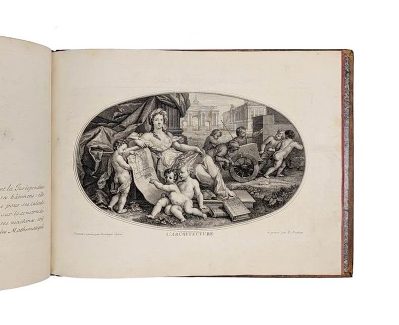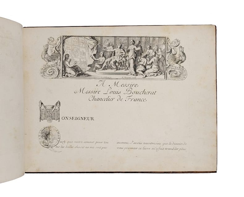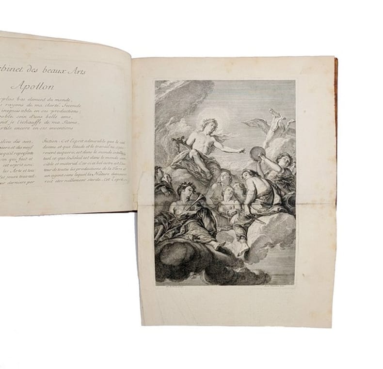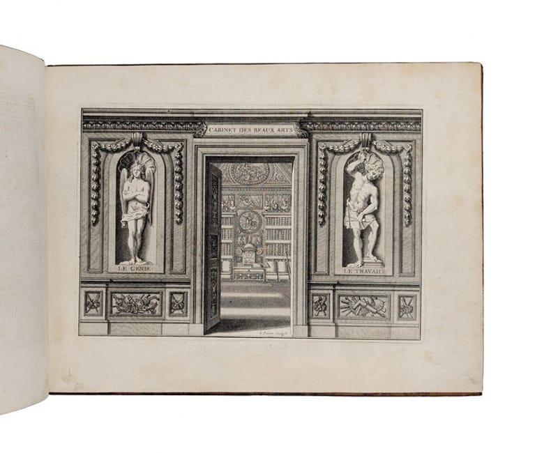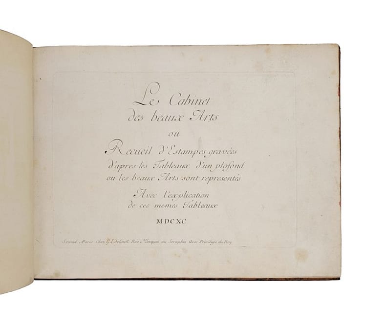 LE CABINET D'UN "MODERNE" DOCUMENTÉ PAR LA GRAVURE. Édition originale de ce recueil de 13 planches (dont une dépliante) reproduisant la décoration du "Cabinet des beaux Arts" installé dans la demeure parisienne de Charles Perrault place de l'Estrapade. La première planche représente une vue de l'entrée du cabinet, la seconde une vue globale de la disposition des peintures sur le plafond, et les 11 planches suivantes le détail des peintures ornant le cabinet : Apollon, Mercure, Minerve, et 8 allégories des beaux Arts dont, curieusement, l'Optique et la Mécanique (définie par Perrault comme la "partie des Mathématiques qui se mele des machines et des forces mouvantes") ; interviennent à la gravure Pierre le Pautre, Girard et Benoit Audran, Louis Cossin, Charles et Louis Simonneau... L'ouvrage est également orné de deux grandes vignettes gravées par Chauveau d'après le Brun et comprend 42 pp. de texte par Charles Perrault. Charles Perrault, contrôleur général des bâtiments du roi, commande à plusieurs artistes les peintures de son cabinet des beaux Arts pour sa maison de la rue Neuve-des-petits-champs. Toutefois, à la mort de Colbert en 1683, il tombe en disgrâce, et le projet est mis en suspens : seul le tableau La Peinture, réalisé par Claude Audran, est alors achevé. Établi en 1685 place de l'Estrapade, Perrault peut poursuivre l'exécution du décor. Il fait appel à Charles de La Fosse (Apollon), Louis de Boullogne (Minerve), Jean-Baptiste Corneille (Mercure), René-Antoine Houasse (L'Éloquence), Alexandre Ubelesqui (La Poésie), Antoine Coypel (La Musique), Bon de Boullogne (L'Architecture), Jacques-Antoine Friquet de Vauroze (La Sculpture), Michel II Corneille (L'Optique) et Jean Jouvenet (La Méchanique). Sept des tableaux, aujourd'hui perdus, ne sont connus que par ce recueil. Selon Marie-Pauline Martin, les peintures du cabinet s'inscrivent dans la continuité des textes composés par Perrault à la fin des années 1680et en particulier du Parallèle des Anciens et des Modernes (1688). En effet, l'inclusion de la Mécanique et de l'Optique reflète sa vision progressiste des arts comme un domaine perfectible dans lequel les savoirs peuvent, comme dans les sciences, s'accumuler. Les allégories, résolument "Modernes", ne font d'ailleurs référence qu'à des inventions du siècle de Louis XIV. En outre, les tableaux constituent un éloge rétrospectif de la politique royale des arts mise en oeuvre par Perrault en tant que premier commis de Colbert. "Peut-on finalement apprécier la stratégie publicitaire de Perrault, et particulièrement la diffusion de son décor par la gravure en 1690, comme une manoeuvre attachée à rétablir son autorité au sein de l'administration du roi ?" (p. 18) L'épître dédicatoire à Louis Boucherat, chancelier de France, semble aller en ce sens. Marie-Pauline Martin, Le Cabinet des Beaux-arts de Charles Perrault: le monument dun moderne. Revue de lart, no. 190. 2015. pp. 9-18. Il existe une contrefaçon bilingue français-flamand, gravée par Peter Schenk, à la date de 1693. PROVENANCE : Raoul Chandon de Briailles (1850-1908), étiquette ex-libris "Cte Chandon de Briailles"contrecollée à la première garde blanche. Président de la maison Moët-et-Chandon, Raoul Chandon de Briailles constitua une importante bibliothèque sur la vigne, le vin et l'histoire champenoise. Acteur de la lutte contre le parasite phylloxéra, il fonda notamment LEcole pratique de Viticulture Moët & Chandon, où fut développé le greffage sur des porte-greffes américains résistants à la maladie. Reliure frottée. Quelques pâles rousseurs. CCFR : Moulins, Aix-en-Provence, Melun, La Rochelle, BnF (sites Arsenal, Tolbiac, Richelieu)