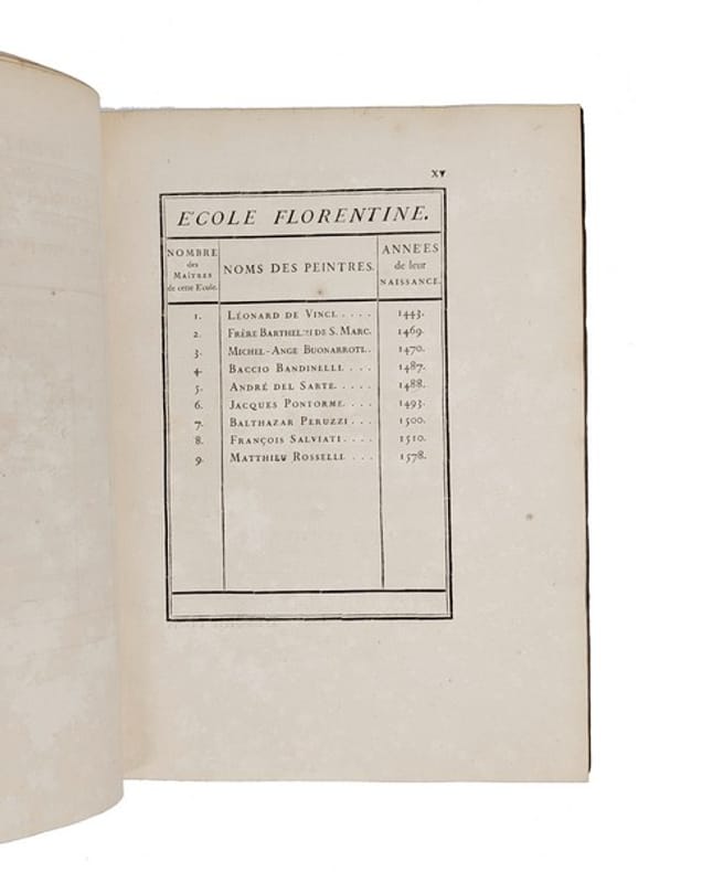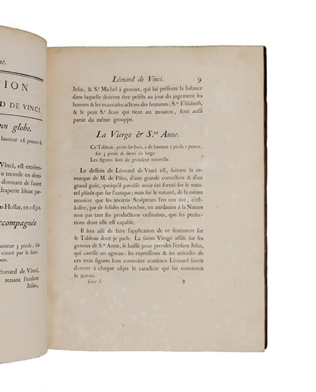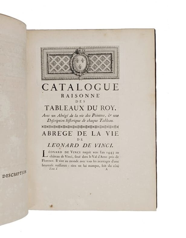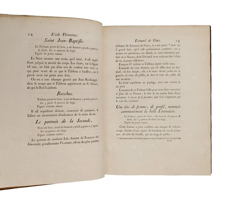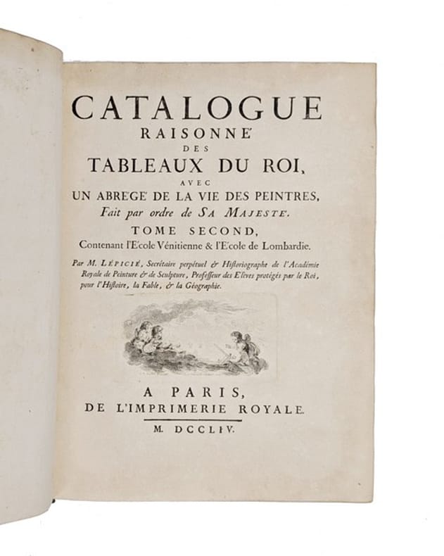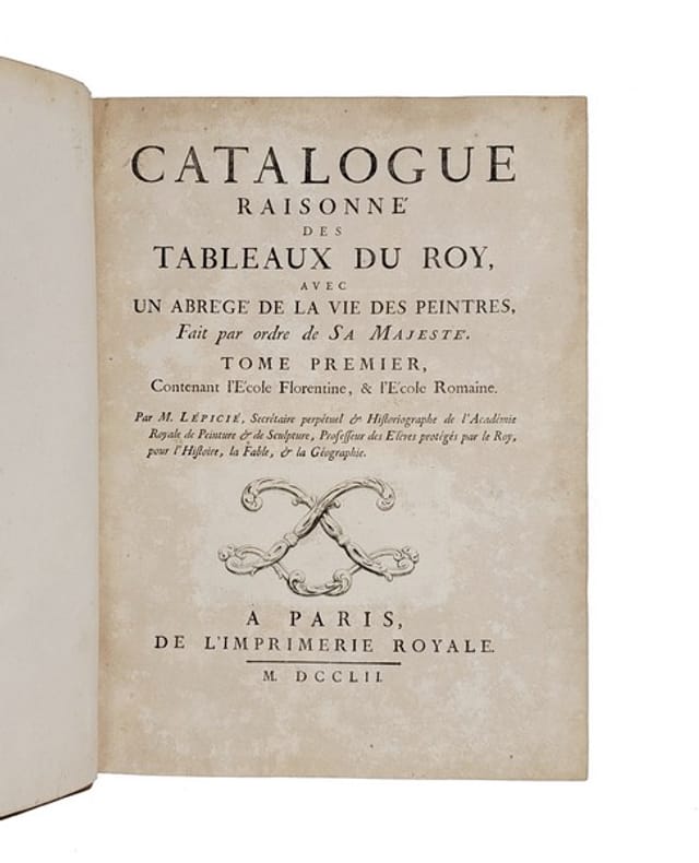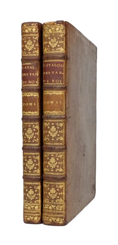 LA JOCONDE ET BIEN D'AUTRES Y COMPRIS LES MOINS BONS. Édition originale de ce catalogue des tableaux de Louis XV. Le premier volume est consacré aux écoles florentine (9 peintres dont Da Vinci et Michel-Ange, pour 23 tableaux) et romaine (15 peintres dont Raphael et Mantegne, 67 tableaux) ; le second aux écoles vénitienne (16 peintres dont Titien et le Tintoret, 98 tableaux) et de Lombardie (13 peintres ou familles dont le Caravage et Manfrède, 121 tableaux). L'ouvrage est illustré de deux vignettes gravées d'après C. N. Cochin (bandeau au tome 1er, titre au tome second). Commandé par Tournehem, ce catalogue raisonné devait couvrir le reste de la collection royale ; toutefois, Lépicié mourut avant de pouvoir l'achever. Lépicié donne une biographie de chaque peintreallant de la notice de plusieurs pages à un laconique "il n'y a rien sur la vie de ce peintre"puis une description de chaque tableau comprenant titre, technique, dimensions, et parfois un commentaire sur la provenance, l'état, une attribution qu'il juge erronée ou la qualité du tableau. De "Diane au Bain" du chevalier Josepin, il estime ainsi : "Le tableau où Diane est représentée dans le bain jetant de l'eau au visage d'Actéon est en si mauvais état, & si peu recommendable pour le mérite de la couleur et du dessein, que je n'en fais mention que pour suivre l'ordre du catalogue" (v.1 p. 138) Élève de Jean Mariette, le graveur François-Bernard Lépicié (1698-1755) exerce un temps en Angleterre. Rentré à Paris en 1737, il est agréé à l'Académie de peinture dont il devient, trois ans plus tard, secrétaire-historiographe. Son Recueil des vies des premiers peintres du roi demeure lui aussi inachevé. PROVENANCE : Pilippe-Laurent de Joubert, ex-libris héraldique contrecollé aux plats supérieurs. Trésorier des états du Languedoc, Philippe-Laurent de Joubert (1729-1792) installe dans son hôtel particulier de la place Vendôme un célèbre cabinet d'histoire naturelle. Amateur et collectionneur d'art, il est l'un des membres fondateurs de la Société des beaux-arts de Montpellier. Il est également associé, dès 1786, de l'Académie royale de peinture et de sculpture de Paris. Un portrait de Joubert peint par Jacques-Louis David est conservé au musée Fabre de Montpellier. Frottements et épidermures à la reliure.