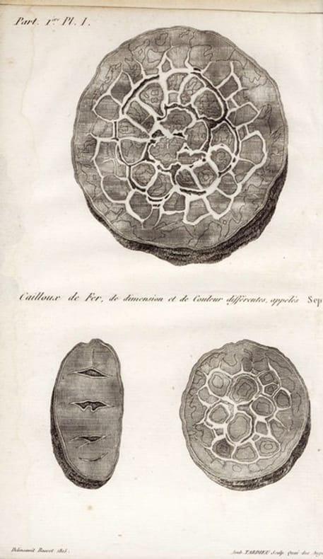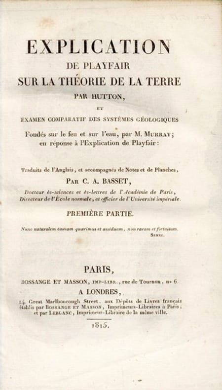 Rare exemplaire de la traduction française de "Illustrations of the Huttonian theory of the earth" publié en 1802 par John Playfair , et de "A comparative view of the Huttonian and Neptunian systems of geology", de M. Murray. James Hutton avait publié son grand ouvrage "Theory of the Earth, with proofs and illustrations" en 1795 ; l'un des pères de la géologie moderne, partisan du plutonisme, il montra notamment l'origine intrusive du granite. Les explications claires de son disciple John Playfair et son ouvrage, soutenu par Charles Lyell (l'ami de Charles Darwin) jouèrent un grand rôle dans la diffusion de ses idées. John Murray (1778-1820) expose dans son ouvrage les systèmes Huttoniens et Neptuniens, sur la formation des roches, et conclut en faveur de cette dernière. Etat satisfaisant (manque le premier plat, cachet à froid d'ex-libris, fente en dos) pour cet exemplaire peu commun méritant d'être établi dans une reliure de qualité.