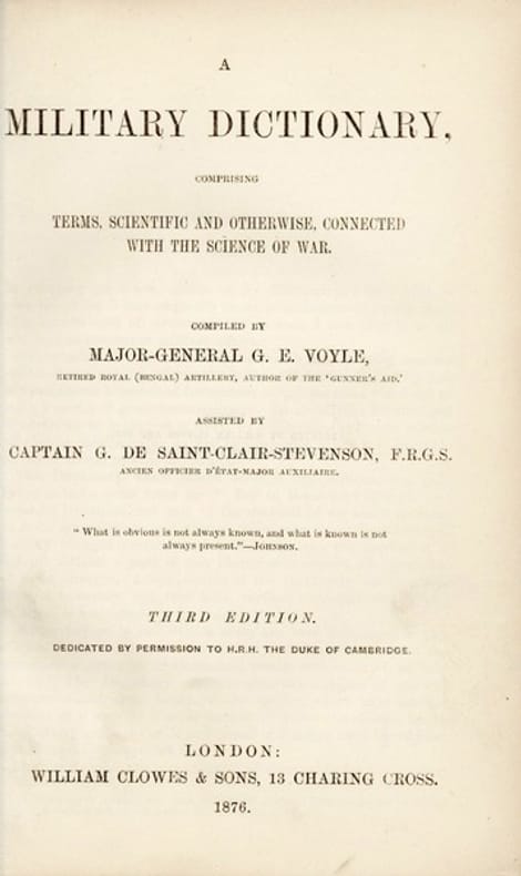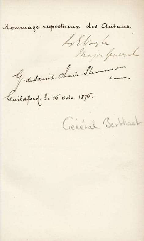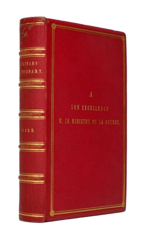 EXEMPLAIRE DE PRÉSENT AU MINISTRE DE LA GUERRE BERTHAUT AVEC DOUBLE ENVOI. 3e édition augmentée de ce dictionnaire anglophone de termes militaires. Compilé par George Elliot Voyle, ancien lieutenant-colonel de la Royal Bengal Artillery, l'ouvrage paraît pour la première fois à Calcutta sous le titre Dictionary of Artillery and Other Military Terms (1871) ; il contient de ce fait quelques termes hindoustanis à l'usage des officiers britanniques récemment arrivés aux Indes. Sont également incluses quelques réflexions sur les armes anciennes ainsi que des notions de premiers secours vétérinaire pour la cavalerie. Cette troisième édition est augmentée par rapport aux précédentes d'articles sur les différentes armées d'Europe. Voyle est assisté dans sa tâche par le capitaine St-Clair-Stevenson, ancien officier d'état major auxiliaire ayant résidé à Londres et à Édimbourg. Son ouvrage Alsace and Lorraine. Past, Present, and Future avait été publié en 1873 au profit des émigrés d'Alsace-Lorraine. En 1878, Stevenson participe en qualité de secrétaire à la première circumnavigation organisée par la Société des voyages d'étude autour du monde à bord du paquebot Junon. Double envoi autographe signé : "Hommage respectueux des auteurs / G. E. Voyle / Major general / G. de st-Clair-Stevenson / Guildford le 16 octo. 1876" PROVENANCE : Jean-Auguste Berthaut (1817-1881), ex-dono estampé au centre du plat supérieur :"A / son excellence / M. le Ministre de la Guerre". Deux fois major de promotion, Berthaut exerce en Afrique de 1842 à 1846. Le colonel Saint-Arnaud raconte, dans une lettre du 17 avril 1845 : "Fleury, des spahis, a eu son cheval tué, et les Arabes arrivaient pour lui couper la tête, quand le capitaine Berthaut, mon aide de camp, est accouru pour le dégager. Rarement j'ai vu autant d'élan et autant de traits de valeur." Affecté en 1854 à la brigade topographique de l'armée d'Orient, Berthaut effectue des relevés en Turquie, en Bulgarie ou encore en Crimée, avant d'être nommé aide de camp du maréchal Canrobert, qu'il accompagne durant la campagne d'Italie. Commandant en second de la garde mobile de la Seine, il est élevé au rang de général de brigade au début de la guerre franco-allemande de 1870. Lors du siège de Paris, il participe au combat de la presqu'île de Gennevilliers et aux batailles de Villiers, Drancy et Buzenval. Au sein de l'armée versaillaise, il collabore avec le maréchal Mac Mahon à la répression de la Commune de Paris. C'est encore Mac Mahon qui, le 16 août 1876, le nomme Ministre de la guerre pendant les vacances parlementaires et sans consultation de la majorité. Berthaut, sévèrement critiqué par les journaux républicains, demeure toutefois à son poste sous les gouvernements Jules Dufaure IV, Jules Simon et Albert de Broglie III puis, solidaire de Mac Mahon lors de la crise du Seize Mai, il donne sa démission en novembre 1877. Berthaut consacre les dernières années de sa carrière au développement de l'instruction militaire. Président du conseil pour le perfectionnement de l'école militaire, il fait paraître en 1881 Principes de stratégie ; l'ouvrage fait figure d'exception dans le contexte de l'après 70, où la priorité est donnée à l'éducation tactique plutôt que stratégique. Quelques épidermures à la reliure, particulièrement en tête du dos. Hardy, R. "La place du général Berthaut dans la renaissance de la pensée militaire après le désastre de 1870." Stratégique, N 99(1), 2010. pp. 87-113.