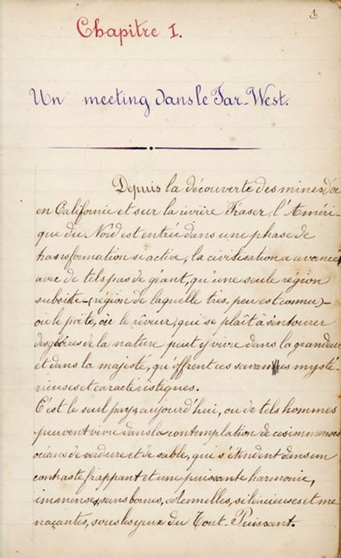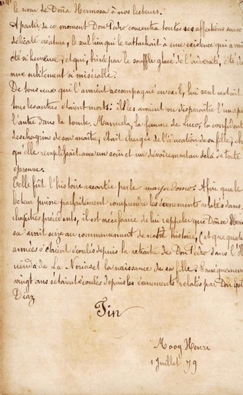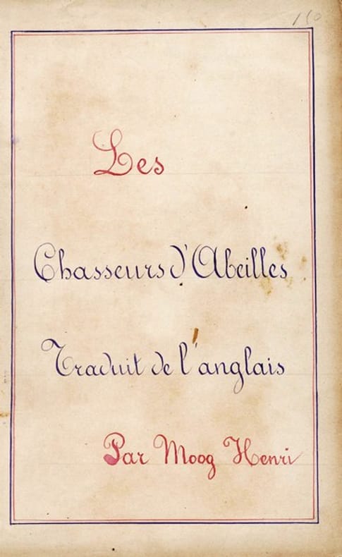 UN "PIERRE MENARD, AUTEUR DU DON QUICHOTTE" DU XIXE SIECLE. Manuscrit autographe inédit d'une traduction française complète du récit d'aventure de Gustave Aimard Les Chasseurs d'abeilles, signée Henri Moog et datée du 1er juillet 1879. L'objet est fort curieux, dans la mesure où le roman, rédigé en français, paraît pour la première en français en 1864. Une traduction anglaise est publiée en 1868 par J. A. Berger, puis rééditée plusieurs fois dans le courant des années 1870. Conscient de l'absurdité de l'entreprise ou induit en erreur par le cadre nord-américain du roman (aucune des éditions anglaises consultées ne fait explicitement mention d'une traduction depuis le français), Henri Moog a retraduit le roman vers le français en s'appuyant sur l'une des éditions anglaises ; en effet, la structure de ses phrases ainsi que ses choix lexicaux sont visiblement calqués sur ceux de la traduction de 1868. Ainsi, au premier paragraphe de l'originale de 1864, on lit : "Depuis la découverte des riches placeres de la Californie et de la rivière Frazer, l'Amérique septentrionale est entrée dans une ère de transformation tellement active, la civilisation a si bien marché à pas de géants que, pour les poëtes et les rêveurs amoureux des grands spectacles de la nature, il n'est plus qu'une contrée, encore aujourd'hui presque inconnue, où ils puissent jouir de l'aspect majestueux et grandiose des mystérieuses savanes américaines. Le traducteur anonyme engagé par J. A. Berger restructure le paragraphe comme suit : "Since de dicovery of the gold-fields in California and on the Fraser River, North America has entered into a phase of such active transformation, civilisation has advanced with such giant strides, that only one region is still extanta region of which very little is knownwhere the poet, or the dreamer who delights in surrounding himself with the glories of nature, can revel in the grandeur and majesty, which are the great characteristics of the mysterious savannahs." Henri Moog, enfin, propose, sur le modèle de l'anglaise : "Depuis la découverte des mines d'or en Californie et sur la rivière Fraser l'Amérique du nord est entrée dans une phase de transformation si active, la civilisation a avancé avec de tels pas de géant, qu'une seule région subsiste région de laquelle très peu est connu où le poëte, où le rêveur , qui se plaît à s'entourer des gloires de la nature peut y vivre dans la grandeur et la majesté, qu'offrent ces savanes mystérieuses et caractéristiques." Prototype de l'écrivain-aventurierdont les péripéties au Mexique et en Californie sont vraisemblablement en grande partie inventées Gustave Aimard rentre définitivement à Paris au début des années 1850 et, dès 1854, enchaîne les publications. Grâce à ses feuilletons consacrés à l'ouest américain, il jouit d'une notoriété similaire à celle d'Eugène Sue ; il peine cependant à répondre à toutes les demandes de ses éditeurs : il donne ainsi à Cadot le roman L'Araucan, en grande partie auto-plagié des Chasseurs d'abeilles paru la même année chez Amyot. On ne sait que peu de choses du "traducteur" de l'ouvrage ; un cadre retrouvé avec le manuscrit porte au dos la mention "Donné à ma mère à l'époque de ma naissance par la comtesse de St Yorre / 10 août 1855 / jour de ma naissance / Henri Moog". Son singulier projet, en tous cas, n'est pas sans évoquer la nouvelle de Borges "Pierre Ménard, auteur du Quichotte". Quelques ratures et corrections. Reliure frottée.
