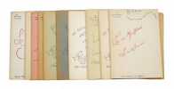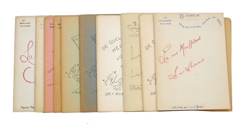 RARE ENSEMBLE DE PUBLICATIONS SUR PARIS EN FACSIMILÉ AUTOGRAPHE, TIRÉES À PETIT NOMBRE. Ensemble de 10 volumes illustrés, en facsimilé autographe (vraisemblablement reproduits par ronéotypie), consacrés à l'histoire de Paris. Jean-Jacques Chaplin produisit quantité de ces petits ouvrages dont une vingtaine pour la série De quelques histoires merveilleuses des rues de Paris, et une vingtaine encore pour la série Le Vrai Visage de Paris. Si le tirage des premiers volumes, publiés aux frais de l'auteur à son adresse du 18 rue Guénégaud, ne dépassait pas les 500 exemplaires (300 pour la plupart des titres), Chaplin semble avoir progressivement trouvé son public : Deauville. Trouville, plus tardif, fut tiré à 1000 exemplaires. Aude (Paris) prit en charge l'édition à partir de 1952 ; en 1953, Chaillot parut avec une couverture de Valentine Hugo. Pour ces premiers volumes, Chaplin semble avoir réalisé lui-même certaines des illustrations ; mais il fait également appel au concours d'artistes, dont Marthe Flandrin, spécialisée dans l'art de la fresque, et le peintre et réalisateur serbe Mi a Popovi . Malgré sa productivité, on ne sait que peu de choses de l'auteur ; un Jean-Jacques Chaplin (Versailles : 1897 ou 1898 - Barbizon : 1972), époux de Jacqueline Bazaine, signe dans Je suis Partout deux articles sur les trusts du pétrole en 1935 et 1936. L'ensemble comprend : De quelques histoires merveilleuses authentiques ou secrètes des rues de Paris. Rue du Bac. In-8° (213 x 159 mm), [1] pl. - XXIV pp. - [1] f. - [1] f. bl., en feuilles sous couverture titrée et illustrée, liens de soie verte. Tirage limité à 300 exemplaires, celui-ci le n°168. Illustré d'un frontispice, d'une composition à pleine page et de quelques ornements. / De quelques histoires merveilleuses authentiques ou secrètes des rues de Paris. Le quai Malaquais. La rue Bonaparte.In-8° (215 x 159 mm), [1] pl. - XXIV pp. - [1] f. - [1] f. bl., en feuilles sous couverture titrée et illustrée, liens de soie bleue. Tirage limité à 300 exemplaires, celui-ci le n°66. Illustré d'un frontispice, d'une composition à pleine page et de quelques ornements. /De quelques histoires merveilleuses authentiques ou secrètes des rues de Paris. La rue Saint Dominique. In-8° (213 x 15è mm), [1] f. - [1] pl. - XXVIII pp. - [1] f. - [1] bl., en feuilles sous couverture titrée. Tirage limité à 500 exemplaires, celui-ci le n°407. Illustré d'un frontispice et de quelques ornements. / De quelques histoires merveilleuses authentiques ou secrètes des rues de Paris. Rue de Vaugirard. In-8° (213 x 157 mm), [1] f. bl. - [1] pl. - XXVIII pp. - [1] f. - [1] f. bl., en feuilles sous couverture titrée. Tirage limité à 500 exemplaires, celui-ci le n°80. Illustré d'un frontispice et de cartes et compositions in-texte. / De quelques histoires merveilleuses des rues de Paris. Le Quai Voltaire. La rue des Saints-Pères. In-8° (216 x 159 mm), [1] pl. - XXIV pp. - [1] f. - [1] f. bl., en feuilles sous couverture titrée, liens de soie jaune. Tirage limité à 300 exemplaires, celui-ci le n°75. Illustré d'un frontispice par Germaine Iwill et d'une composition à pleine page et d'ornements par Mi a Popovi . / De quelques histoires merveilleuses des rues de Paris. La rue du Cherche-Midi In-8° (217 x 158 mm), [1] f. bl. - [1] pl. - [1] f. - XVI pp. - [2] pl., en feuilles sous couverture titrée. Tirage limité à 300 exemplaires, celui-ci le n°52. Illustré d'un frontispice par Marthe Flandrin, et deux planches R. Lalau et Mi a Popovi . / De quelques histoires merveilleuses des rues de Paris. La rue Saint-André-des-Arts. La rue Hautefeuille. In-8° (213 x 151 mm), [1] pl - XX pp. - [1] f. - [1] f. bl., en feuilles sous couverture titrée. Tirage limité à 300 exemplaires, celui-ci le n°29. Illustré par José d'un frontispice et d'une composition à pleine page. / De quelques histoires merveilleuses des rues de Paris. La rue Mouffetard. La rue Lhomond. In-8° (214 x 155 mm), [1] pl. - XX pp. - [1] f. - [1] f. bl., en feuilles sous couverture titrée. Tirage limité à 300 exemplaires, celui-ci le n°69. Illustré par Louis Jaque d'un frontispice et de deux grands in-texte. / De quelques histoires merveilleuses des rues de Paris. Le Boulevard Saint-Michel. In-8°(214 x 158 mm) - XVI pp. - [1] f. bl., [1] pl. - [1] f., en feuilles sous couverture titrée. Tirage limité à 300 exemplaires, celui-ci le n°175. Illustré d'un plan et de quelques ornements. /De quelques histoires merveilleuses des rues de Paris. Deauville Trouville. In-8° (215 x 157 mm), [1] pl. - [1] f. - XXXII pp., en feuilles sous couverture titrée. Tirage limité à 1000 exemplaires (celui-ci le n°25), dont 50 hors-commerce.Illustré d'un frontispice et de nombreuses compositions in-texte par G. Maggiora. / Pour les ouvrages parus à l'adresse de l'auteur, plusieurs bibliothèques françaises recensent une unique plaquette dans leur fonds catalogué : bibliothèque de Moulins, bibliothèque du tourisme et des voyages (Paris), bibliothèque de l'Hôtel de Ville (Paris). Le fonds patrimonial Heure Joyeuse (Paris) en possède deux. Tous les titres présents dans ce lot sont toutefois absents de ces collections. La bibliothèque des Archives Nationales détient 25 opuscules (reliés en deux volumes) de la série Le Vrai Visage de Paris, mais aucun de la série De quelques histoires merveilleuses des rues de Paris. Enfin, la bibliothèque historique de la ville de Paris possède une collection importante des plaquettes de Chaplin, mais tous les titres présents ici sont absents de leur fonds, excepté La rue Saint-André-des-Arts. La rue Hautefeuille. Quelques décolorations aux couvertures.