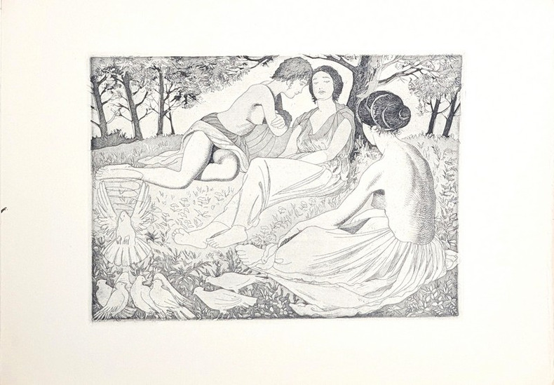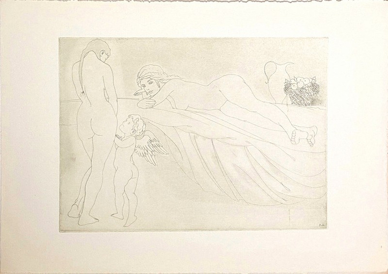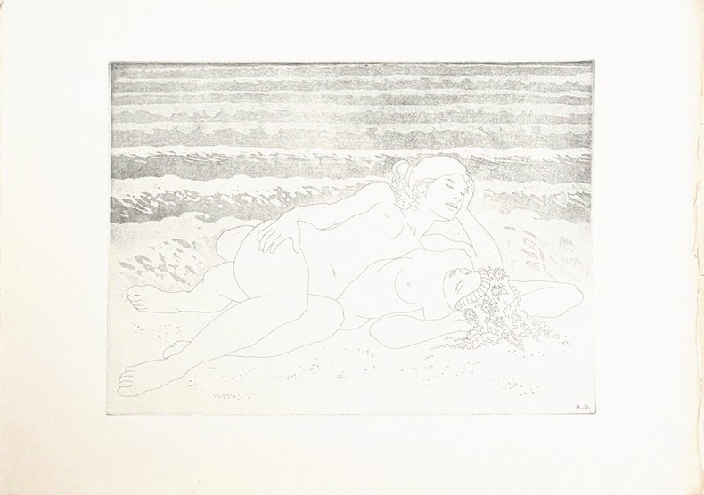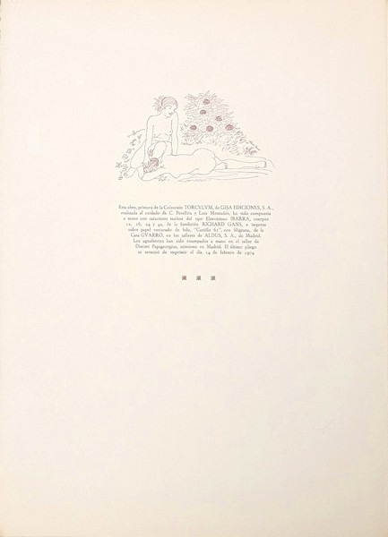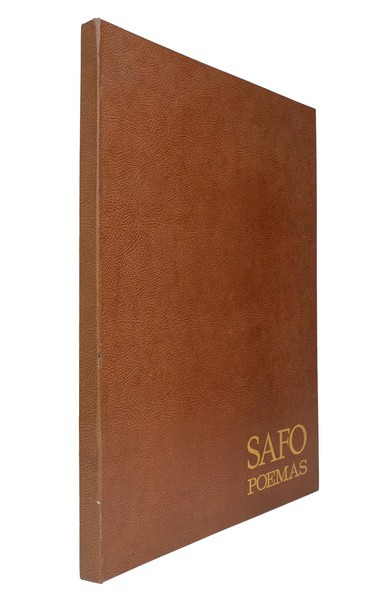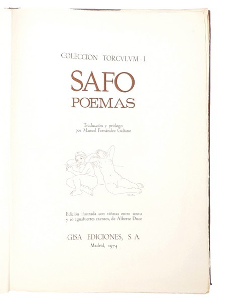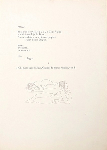 10 GRANDES EAUX-FORTES D'ALBERTO DUCE. Recueil de 9 poèmes de Sapho en traduction espagnole, accompagné de 5 illustrations in-texte et d'une suite de 10 eaux fortes par Alberto Duce. Notice par Manuel Fernández Galiano. Tirage limité à 185 exemplaires, celui-ci un exemplaire non-numéroté bien complet de la suite des 10 eaux-fortes qui ne sont toutefois pas signées à la main. Les 25 premiers exemplaires comportent cuivres originaux, dessins originaux et épreuves. Les 100 exemplaires suivants comprennent la suite de 10 eaux fortes signées à la main. Les 50 suivants, en français (traduction d'Alain Kélépikis) comprennent la même suite. Il a également été tiré 10 exemplaires de collaborateurs. Envoi autographe signé de lauteur à lencre bleue « Pour un anniversaire, à Toi, Thérèse, dont le raffinement et la culture n'ont pas de frontières. Affectueusement, Duce ». Formé à Madrid, où il réalise des illustrations pour la publicité et le cinéma, des décors de théâtre et des peintures murales, Alberto Duce (1915-2003) participe en 1947 à la première exposition du groupe d'avant-garde Grupo Pórtico. Il se rend à Paris puis à Washington, où il réside jusqu'en 1961, exerçant notamment comme portraitiste et comme conseiller artistique de l'Ambassade d'Espagne. Aucun exemplaire au CCFr, ni à l'OCLC.